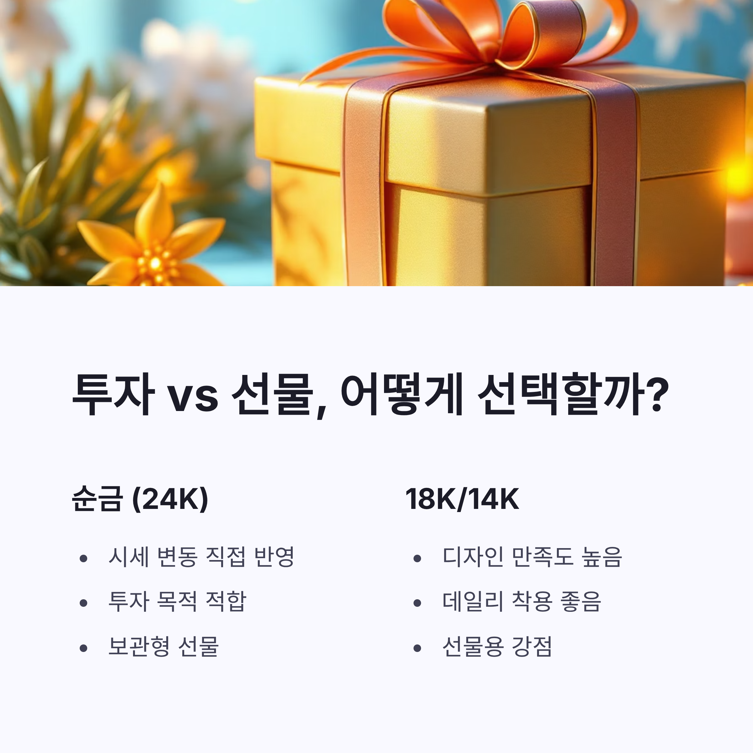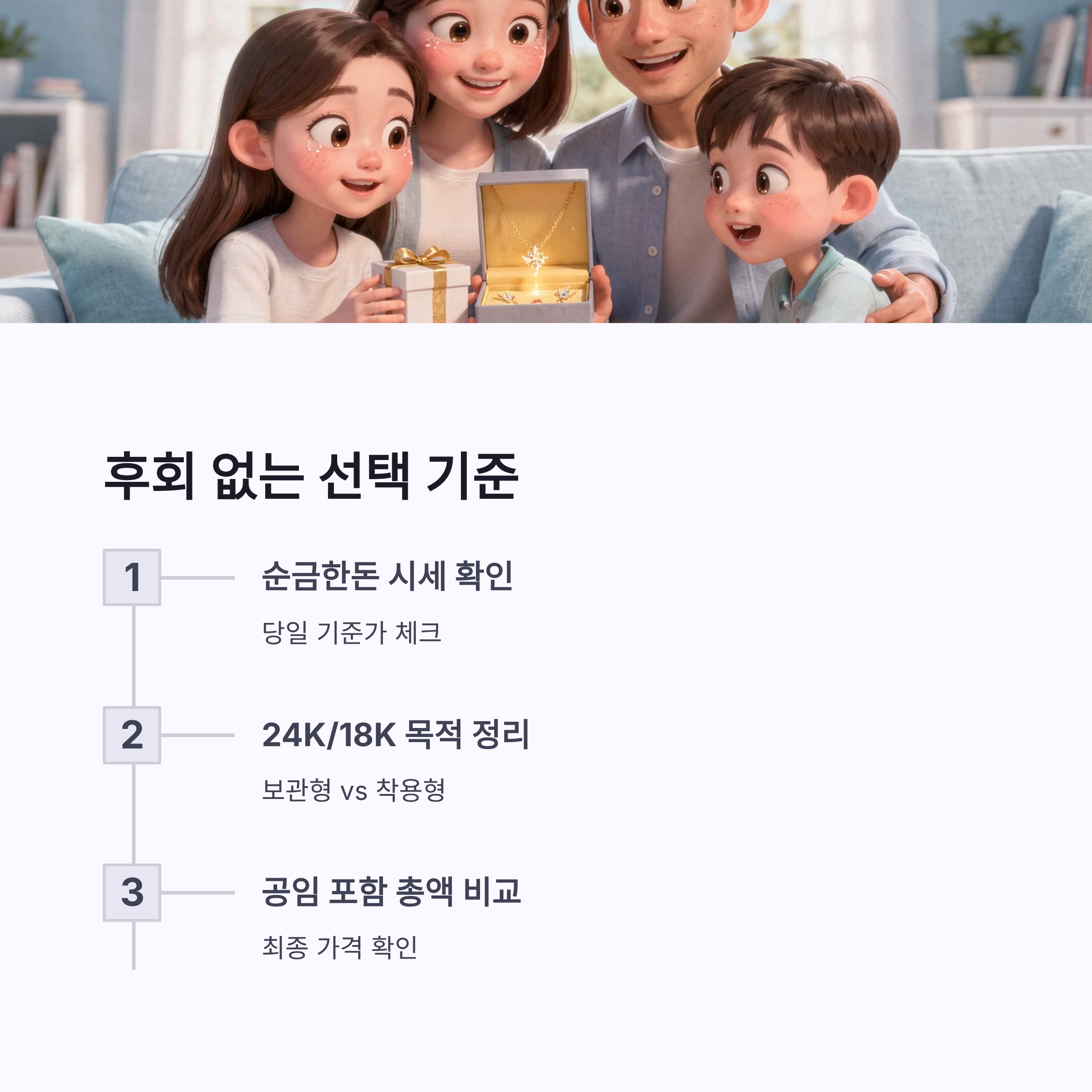 여기서 현실 팁 하나… 순금한돈 시세만 보고 14k 18k를 “투자처럼” 사면 약간 허무할 수 있어요 ㅠㅠ 주얼리는 되팔 때 ‘공임’이 거의 그대로 인정되지 않는 경우가 많아서, 매입가는 보통 “금 함량 기준”으로 잡히는 편이거든요. 대신 14k/18k는 데일리 착용, 디자인 만족감이 좋아서 선물용으로는 또 강해요. 저는 결국 “부모님이 착용을 하실지”가 갈림길이더라구요.