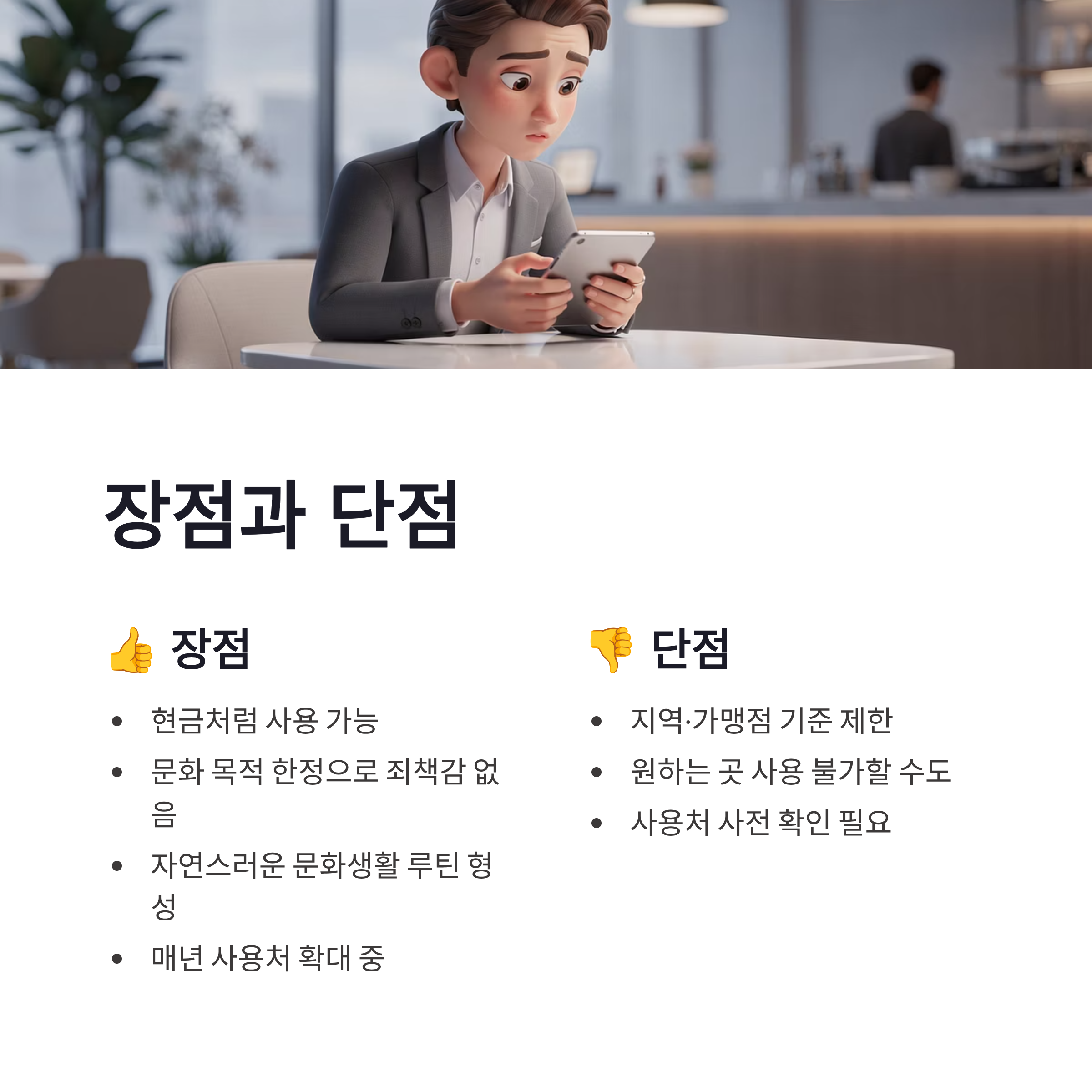 | 구분 | 사용 가능 예시 | 체감 포인트 | | -- | -------------- | ------------- | | 영화 | CGV·메가박스 일부 지점 | 소액 결제 부담 줄어듦 | | 전시 | 도립·시립 미술관 | 문화 접근성 ↑ | | 공연 | 연극·소규모 공연 | 평소 안 보던 장르 도전 | | 도서 | 지정 서점 | 책값 체감 완화 |