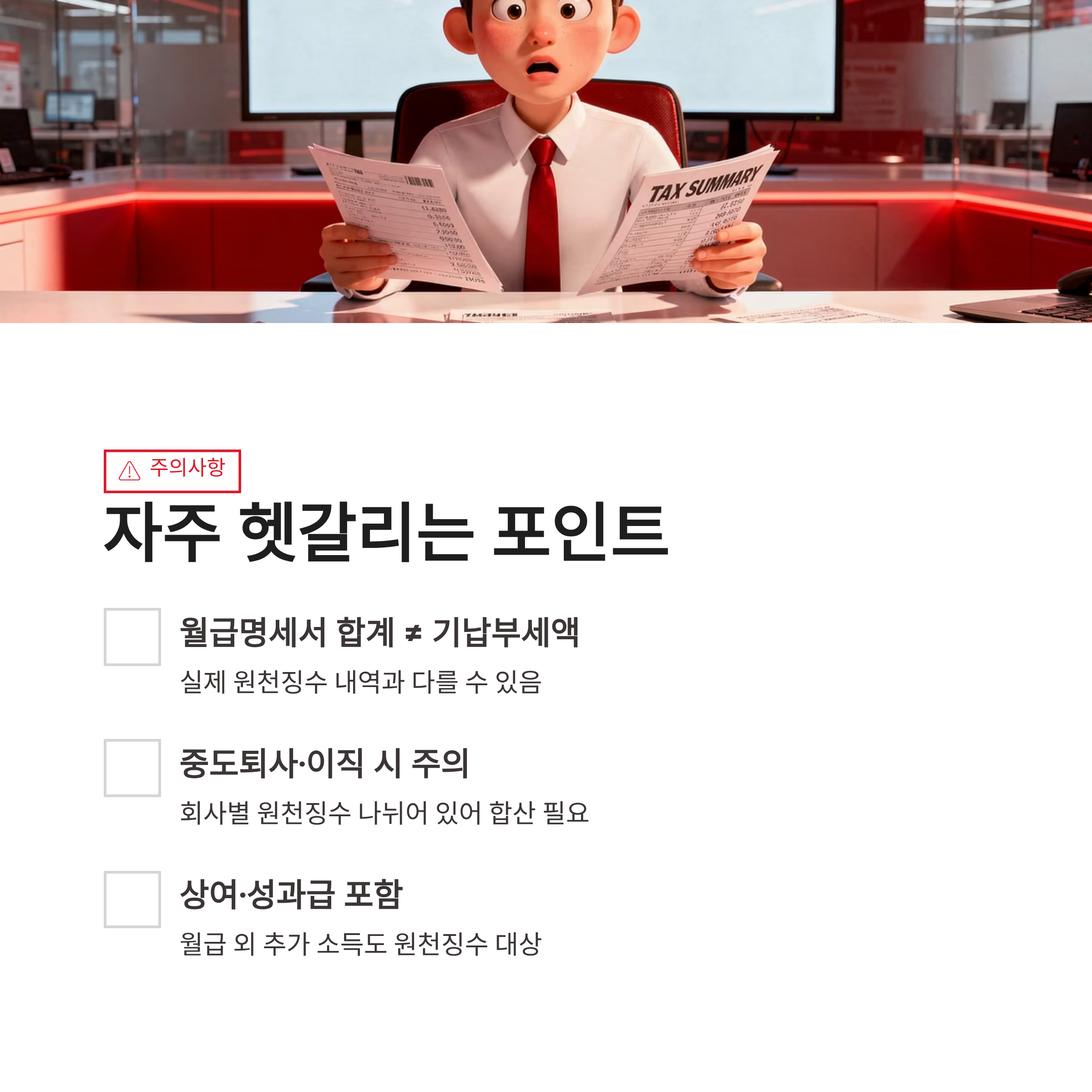 * 월급명세서 세금 합계 ≠ 실제 기납부세액 * 중도퇴사, 이직 있으면 금액 달라질 수 있음 * 상여, 성과급도 원천징수 포함
