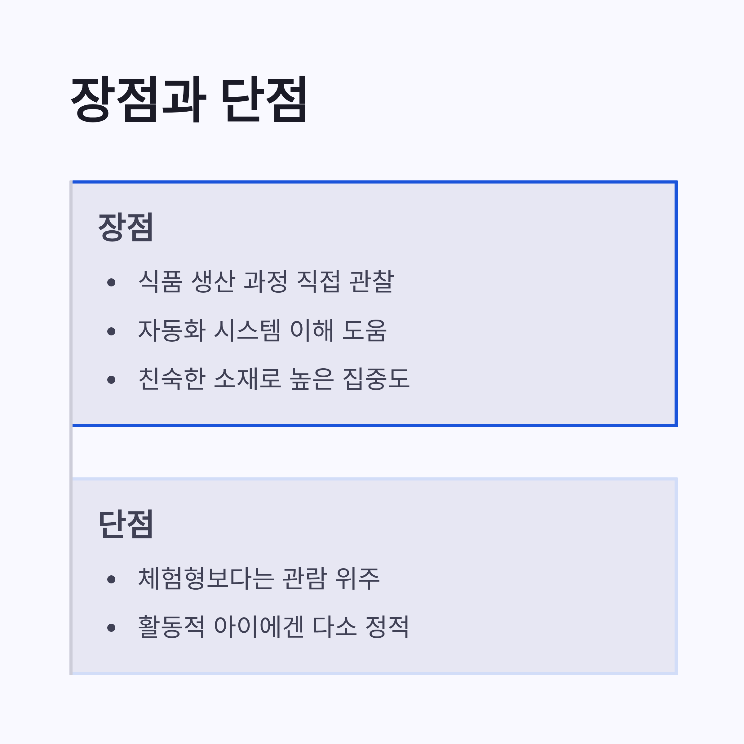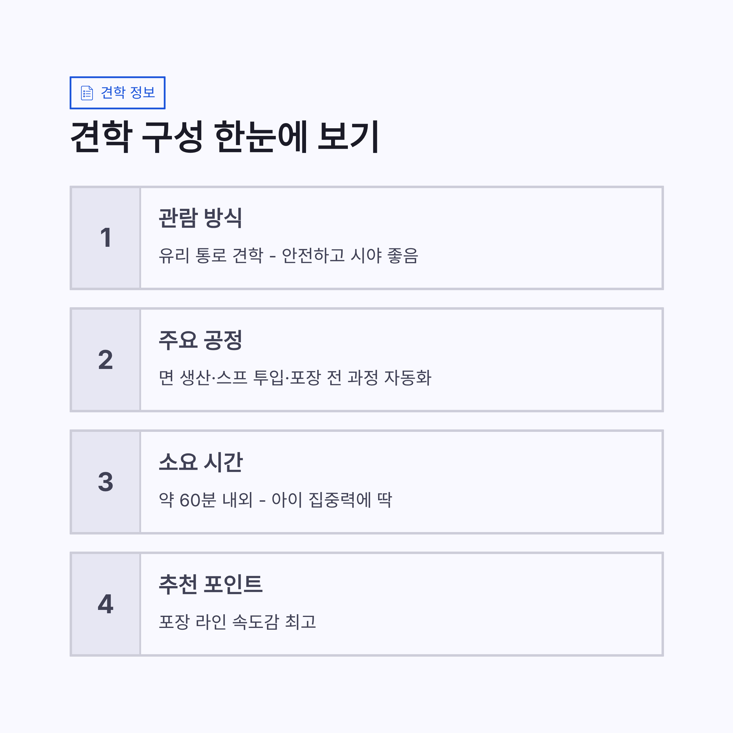 농심 안양공장 견학 추천 연령은 초등학교 저학년 이상이 딱 좋았습니다. 너무 어리면 설명 이해가 살짝 어려울 수도 있어요. 장점은 식품이 만들어지는 과정을 직접 눈으로 본다는 점, 그리고 자동화 시스템 이해에 도움이 된다는 거구요. 단점이라면 체험형 활동보다는 관람 위주라 활동적인 아이에겐 조금 심심할 수 있겠더라구요. 그래도 라면이라는 소재가 워낙 친숙해서 집중도는 높은 편이었어요. 요즘 공장 견학 프로그램 중에서는 만족도 꽤 높은 쪽이라고 느꼈습니다.