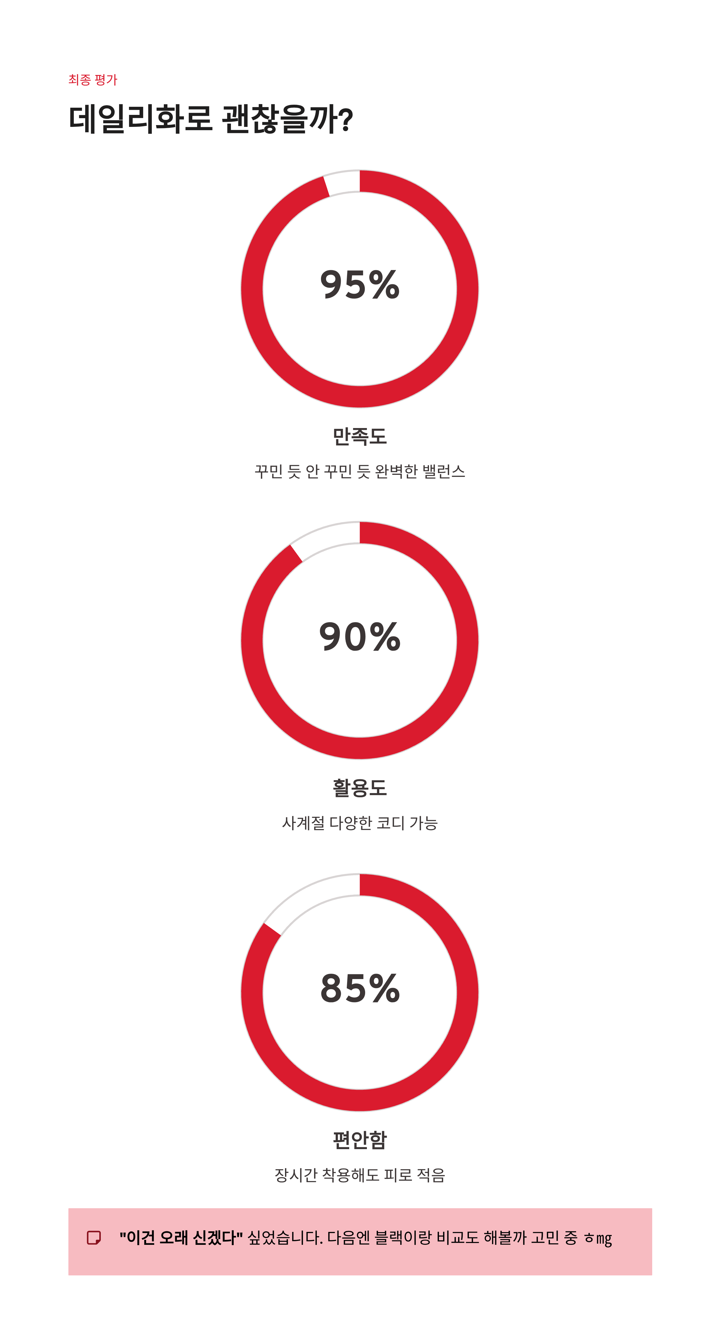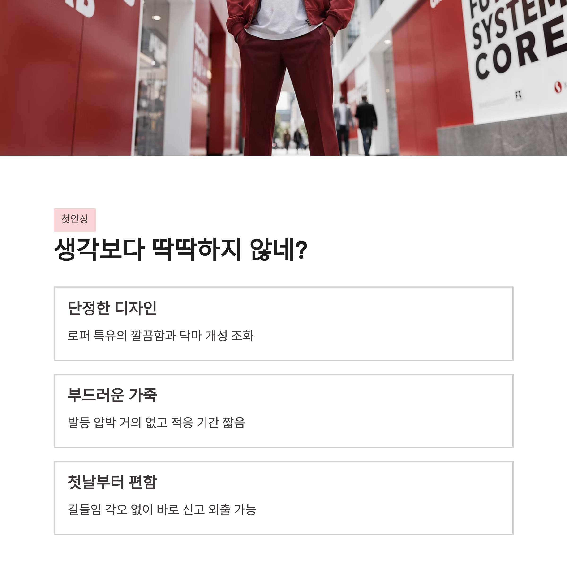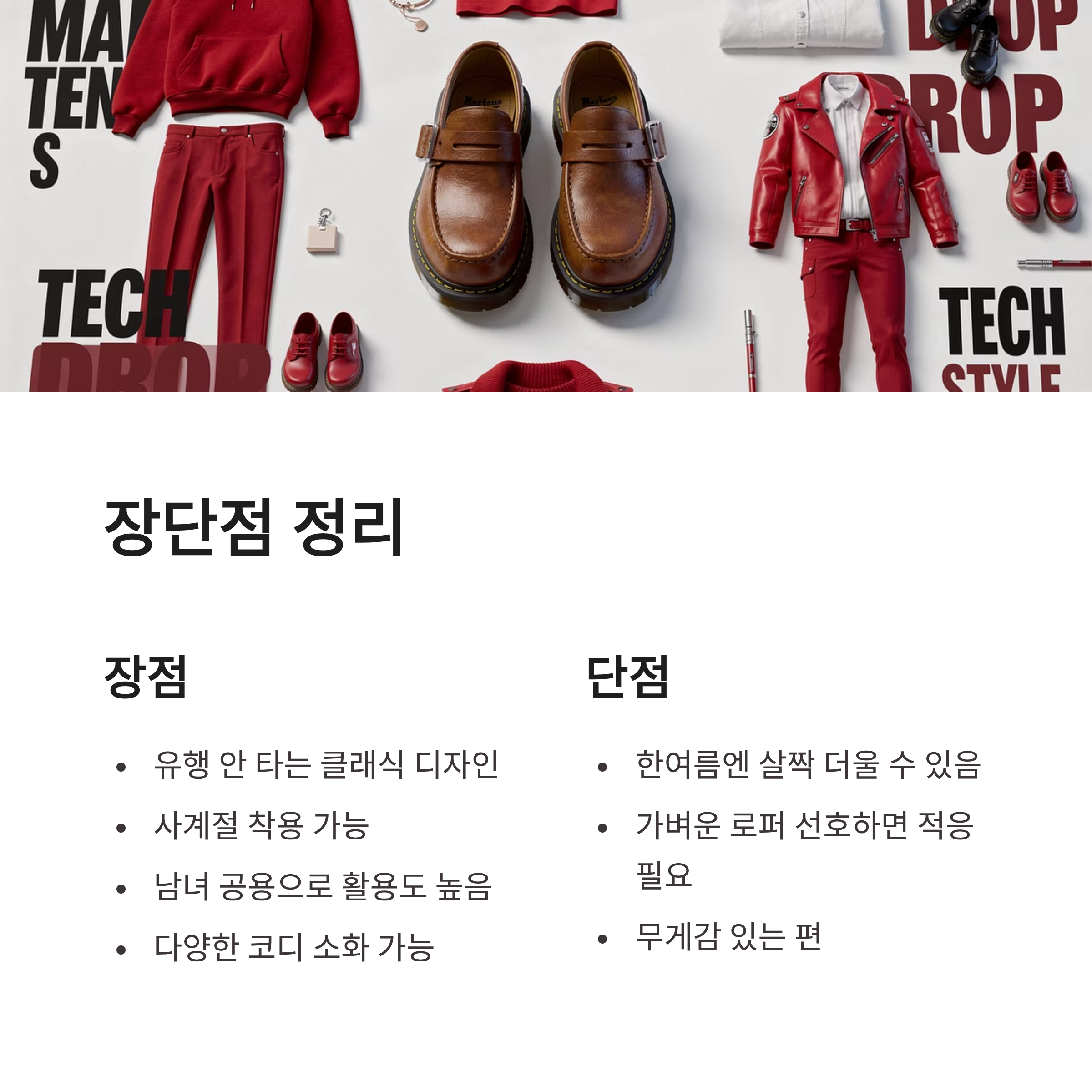 코디는 진짜 말해 뭐해요. 슬랙스에 신으면 세미포멀 느낌 나고, 데님에 신으면 바로 꾸안꾸 완성. 남녀 공용으로 많이 신는 이유가 있더라구요. 특히 요즘 유행하는 와이드 팬츠랑 궁합이 좋아서 다리 라인도 예쁘게 떨어졌어요. 장점은 확실해요. 유행 크게 안 타는 디자인, 계절도 거의 안 가리고 신을 수 있음. 단점이라면 여름 한복판엔 살짝 덥고, 무게가 가벼운 로퍼만 신던 분들은 처음에 “오?” 할 수 있어요. 그래도 전체적인 밸런스는 만족이었구요.