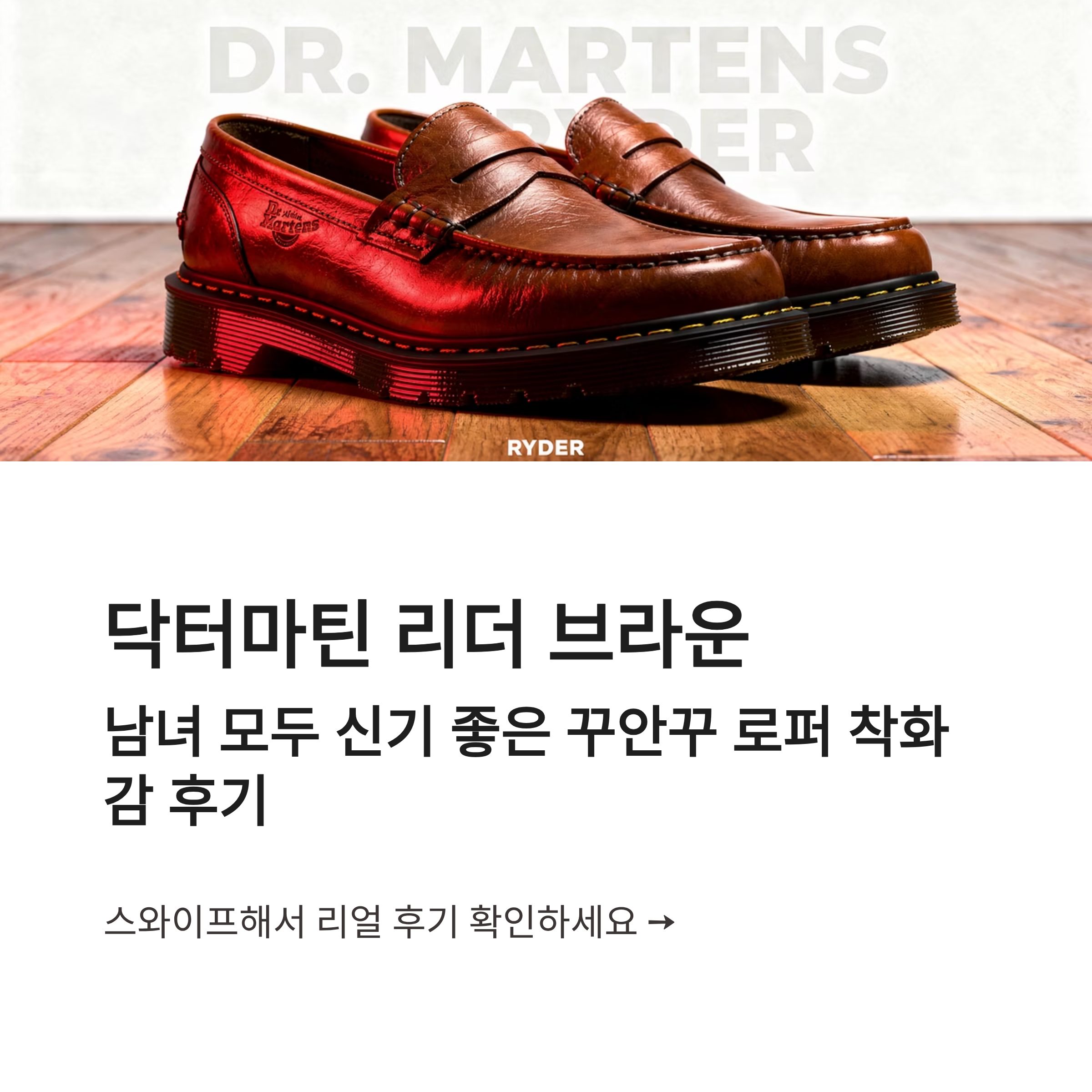 요즘 닥터마틴 리더 브라운 진짜 여기저기서 보이더라구요. 처음엔 “닥마가 이렇게 깔끔했나?” 싶었는데, 실물 보니까 이해가 딱 됐어요. 로퍼 특유의 단정함은 살리고, 닥마 특유의 묵직함은 살짝 덜어낸 느낌? 저는 발 넣자마자 생각보다 딱딱하지 않네 하고 놀랐구요. 처음 신었을 때 발등 압박도 거의 없었고, 가죽이 너무 빳빳하지 않아서 적응 기간도 짧았어요. 솔직히 닥마는 길들임 각오해야 한다는 이미지가 있잖아요. 근데 리더 브라운은 첫날부터 그냥 신고 돌아다녔습니다 ㅎㅎ 컬러도 브라운이라 부담 없고, 캐주얼이든 슬랙스든 자연스럽게 어울리더라구요.