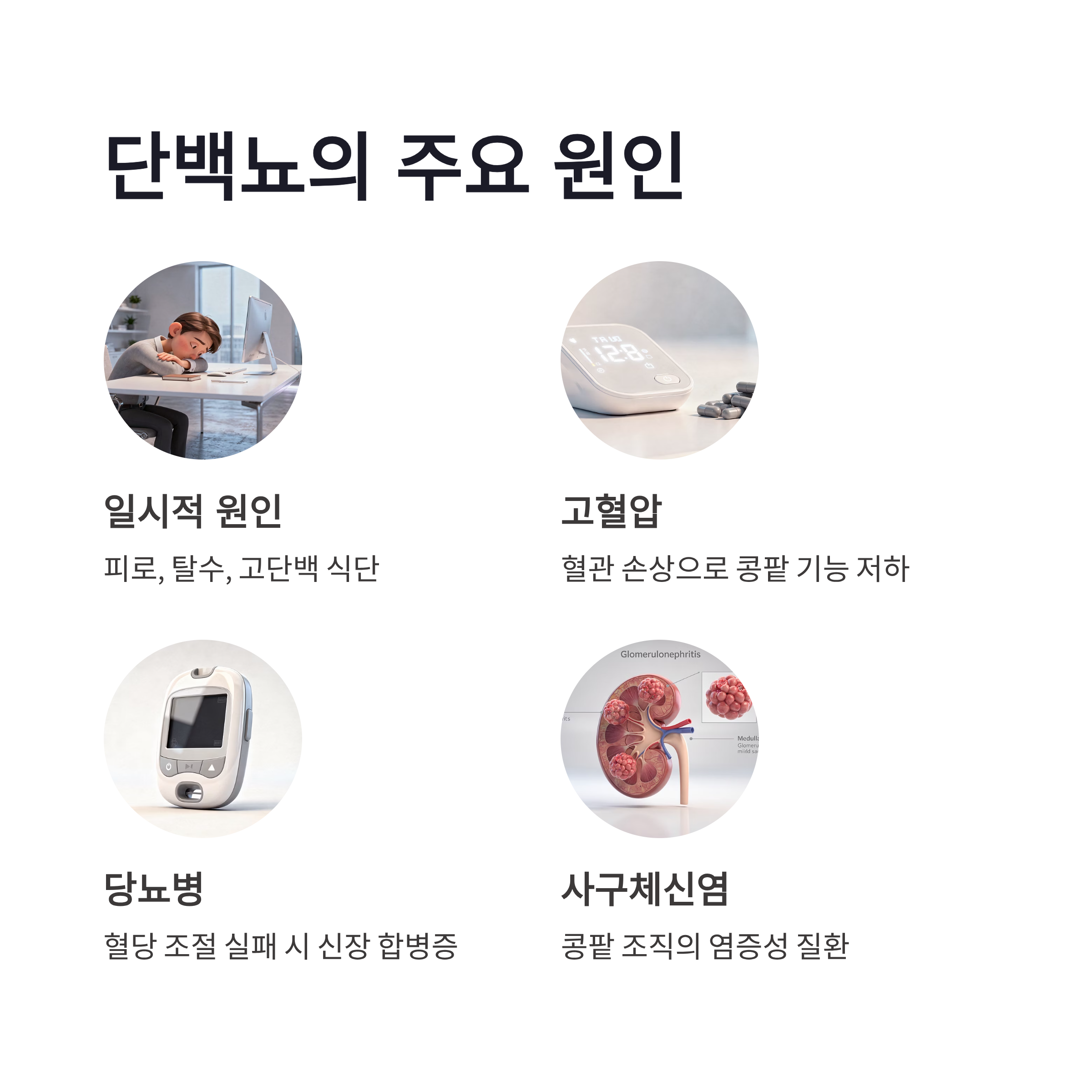 | 일시적 단백뇨 | 피로·운동·스트레스 | 휴식 후 재검 |
