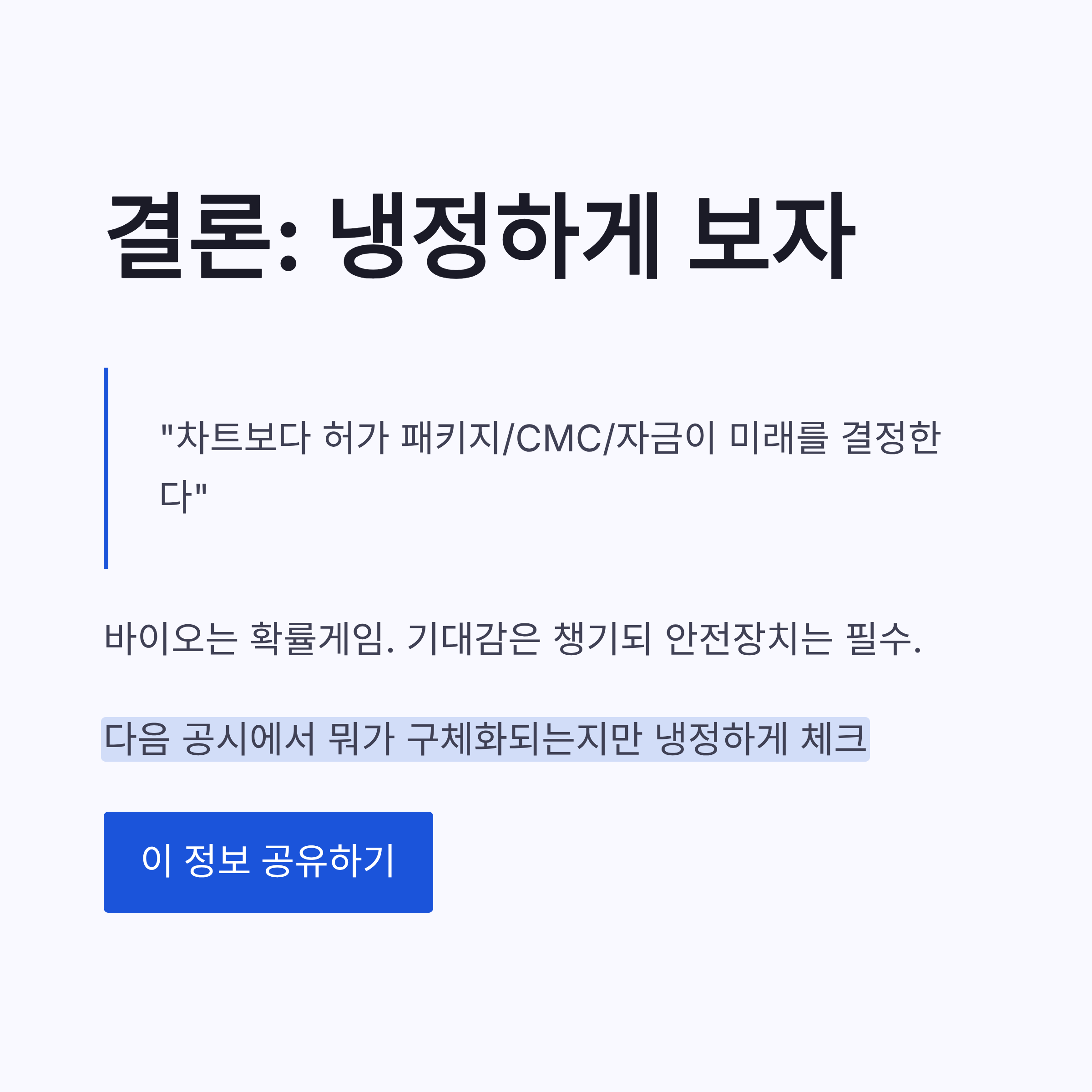 * 상방 시나리오: 허가 프로세스가 예상대로 착착 + 추가 리스크가 안 터짐 → “기대감이 일정으로 바뀌는 구간”에서 재평가 * 박스 시나리오: 데이터 해석 논쟁/추가 보완 요구/일정 밀림 → 기대는 남는데 피로감으로 횡보 * 하방 시나리오: 자금조달 타이밍이 꼬이거나, 허가/CMC에서 예상 못한 변수 → 급등분 반납이 빨라짐
