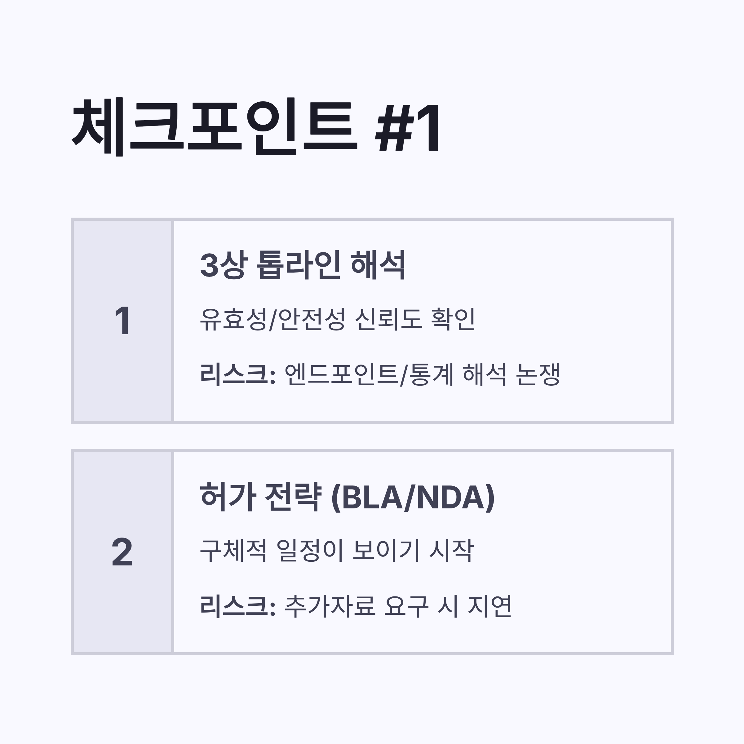 | 2) 허가 전략(BLA/NDA) | 일정이 보이기 시작 | 추가자료 요구 시 지연 |