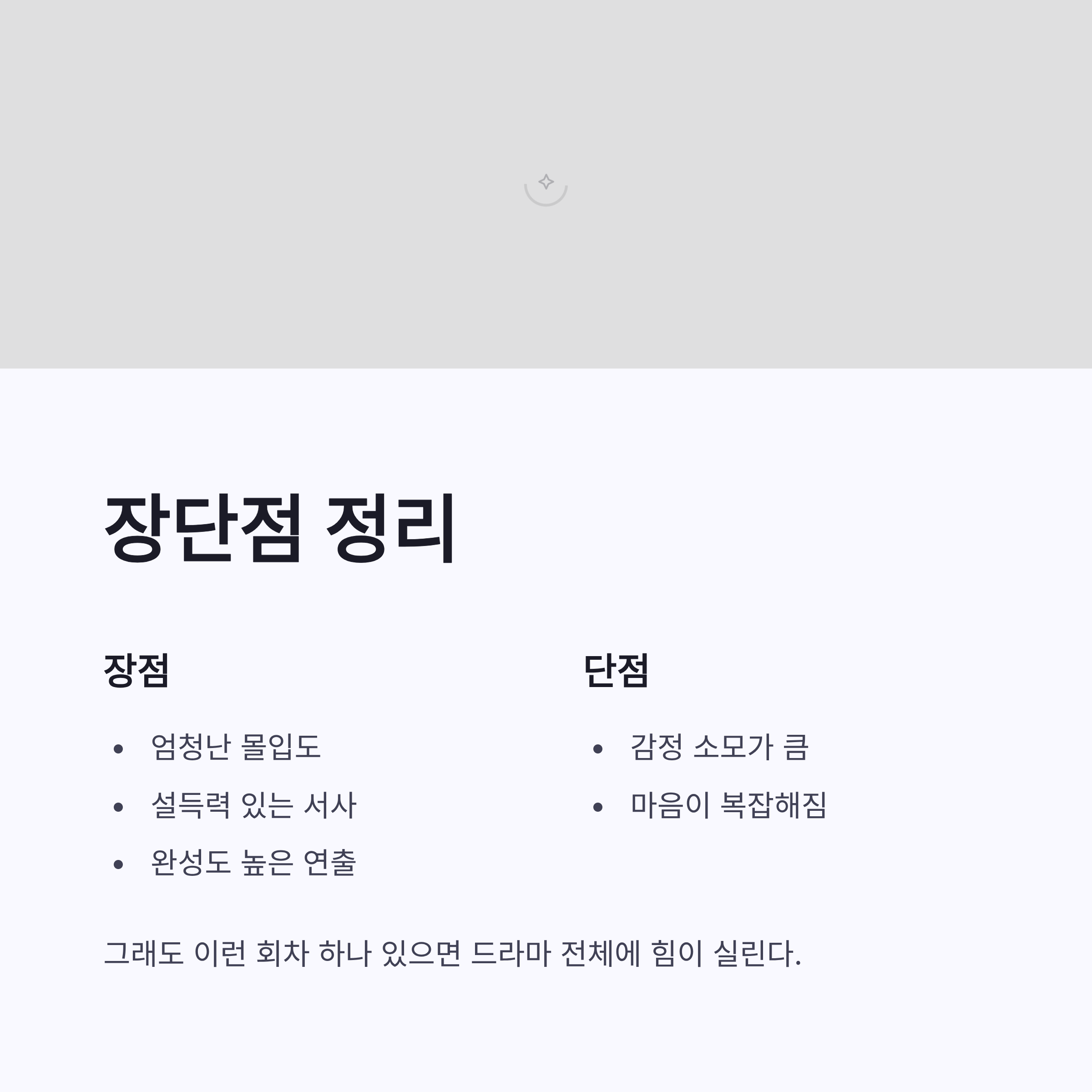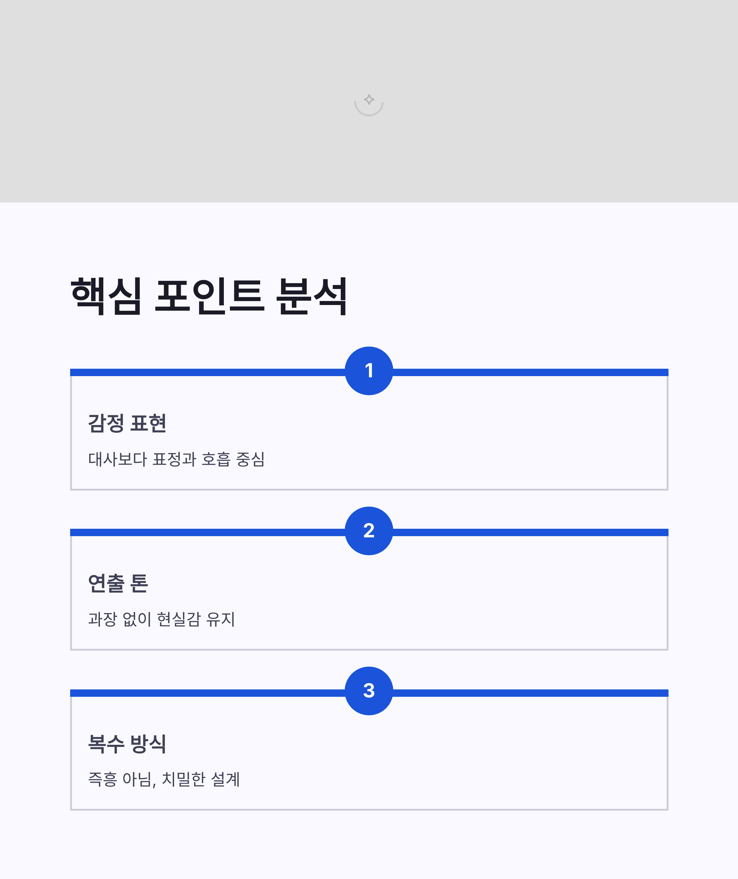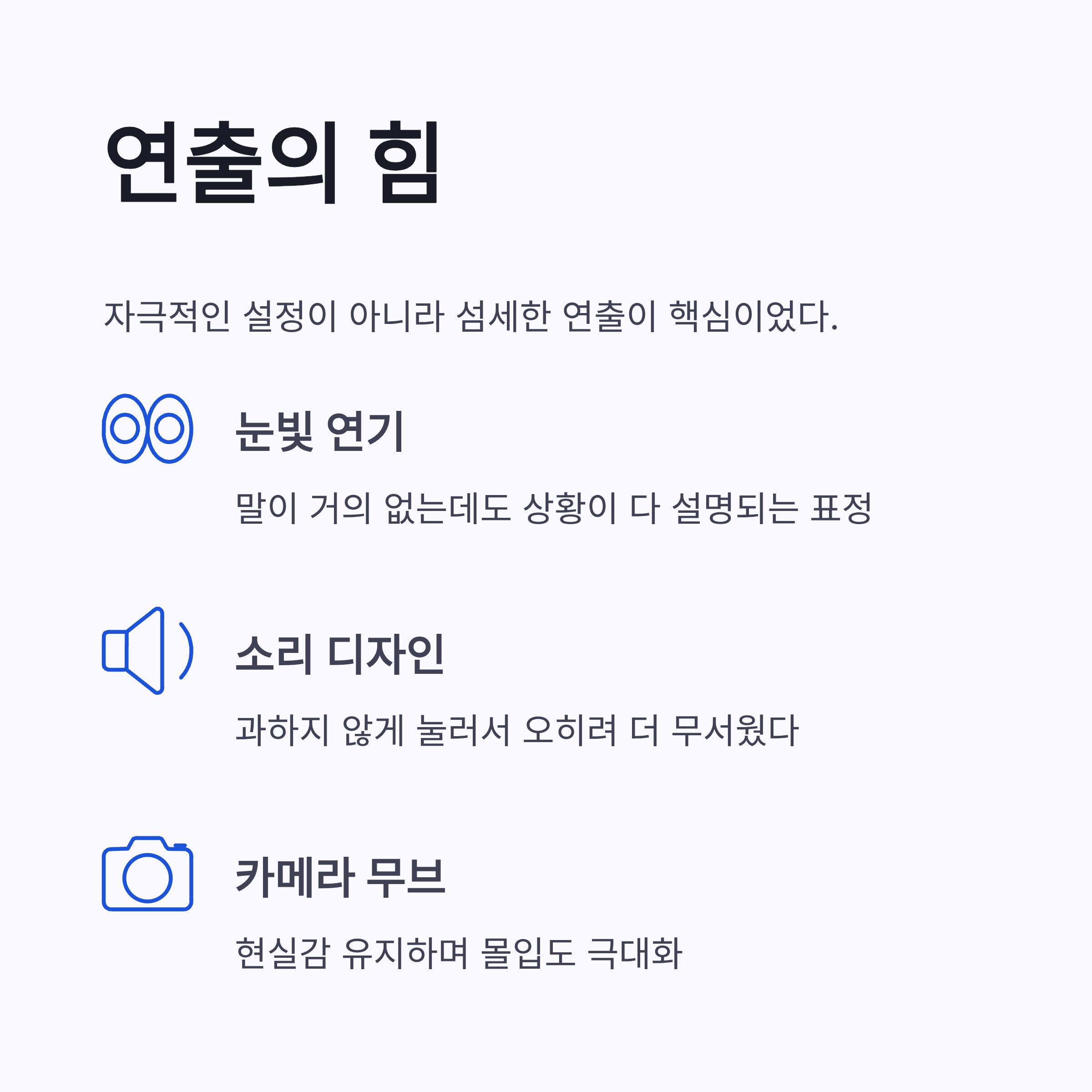 | 감정 표현 | 대사보다 표정과 호흡 중심 |