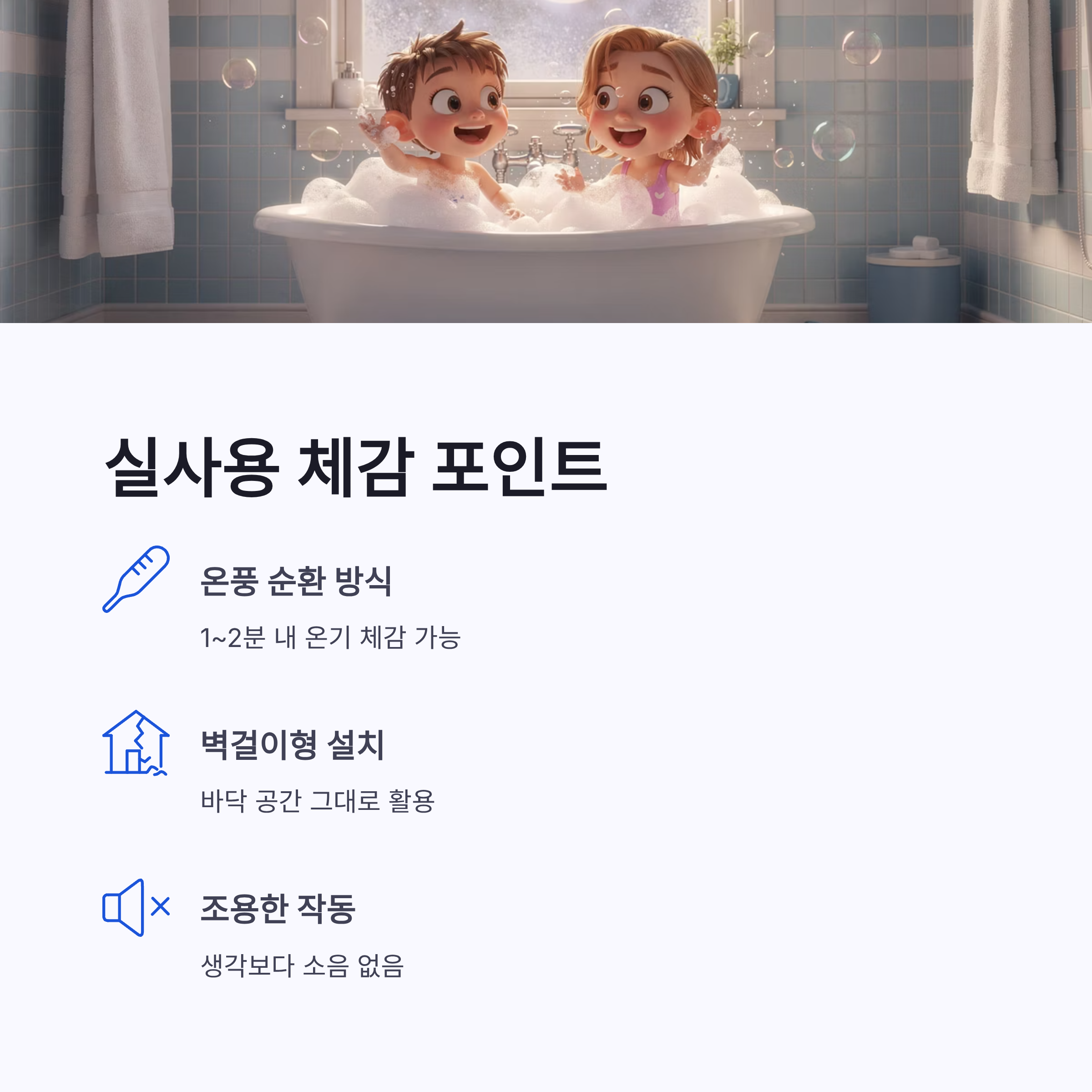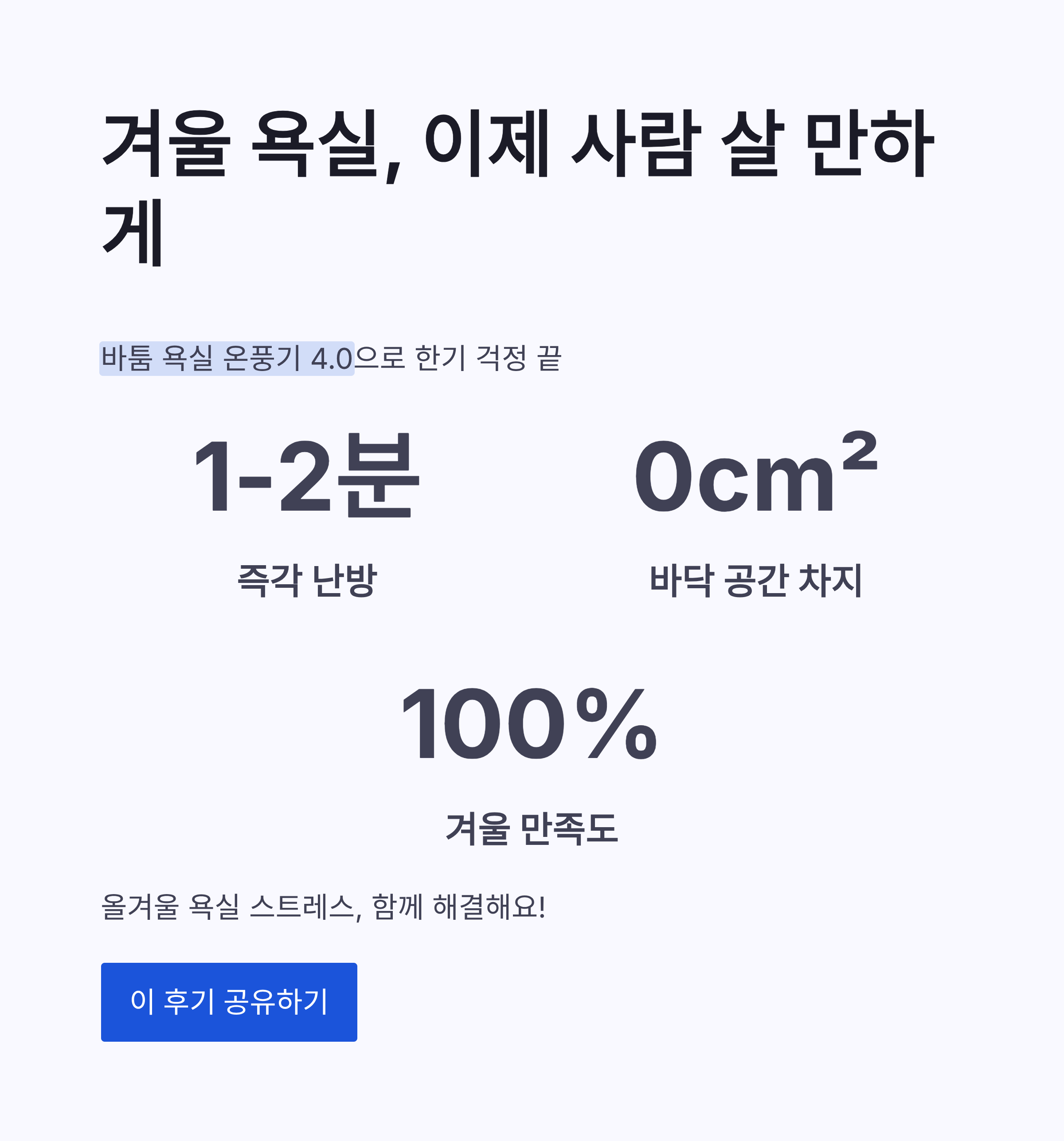 정리해보면 바툼 욕실 온풍기 4.0은 겨울 욕실에서 느끼는 한기를 현실적으로 줄여주는 아이템이었어요. 샤워 전·후 덜 떨게 되고, 아이 목욕도 한결 편해졌구요. 설치 부담도 크지 않고, 공간 차지도 적어서 만족감이 꽤 컸습니다. 올겨울 욕실 들어갈 때마다 “아 춥다…” 소리 내고 계셨다면, 이건 진짜 한 번쯤 고민해볼 만한 선택 같아요. 겨울 욕실, 조금은 사람 살 만하게 바꿔보고 싶지 않으신가요? ㅎㅎ