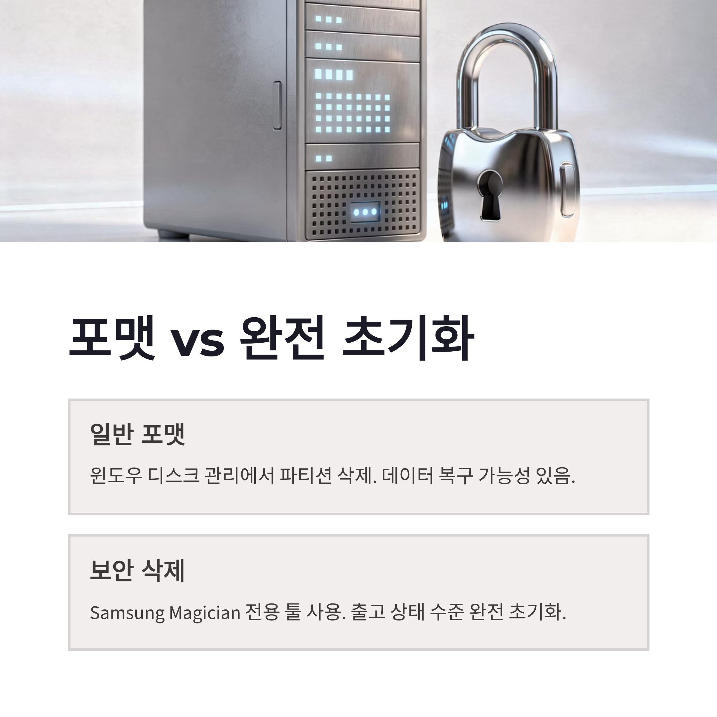 여기서 중요한 포인트! 일반 포맷은 데이터 복구 가능성이 남아 있어요. SSD는 구조상 흔적이 남기 쉬워서, 판매·양도 목적이라면 솔직히 불안하더라구요. 그래서 저는 무조건 삼성 SSD 초기화는 전용 방식으로 하는 편입니다. 특히 Samsung SSD는 전용 툴이 잘 만들어져 있어서 그걸 안 쓰는 게 손해 느낌이었어요.