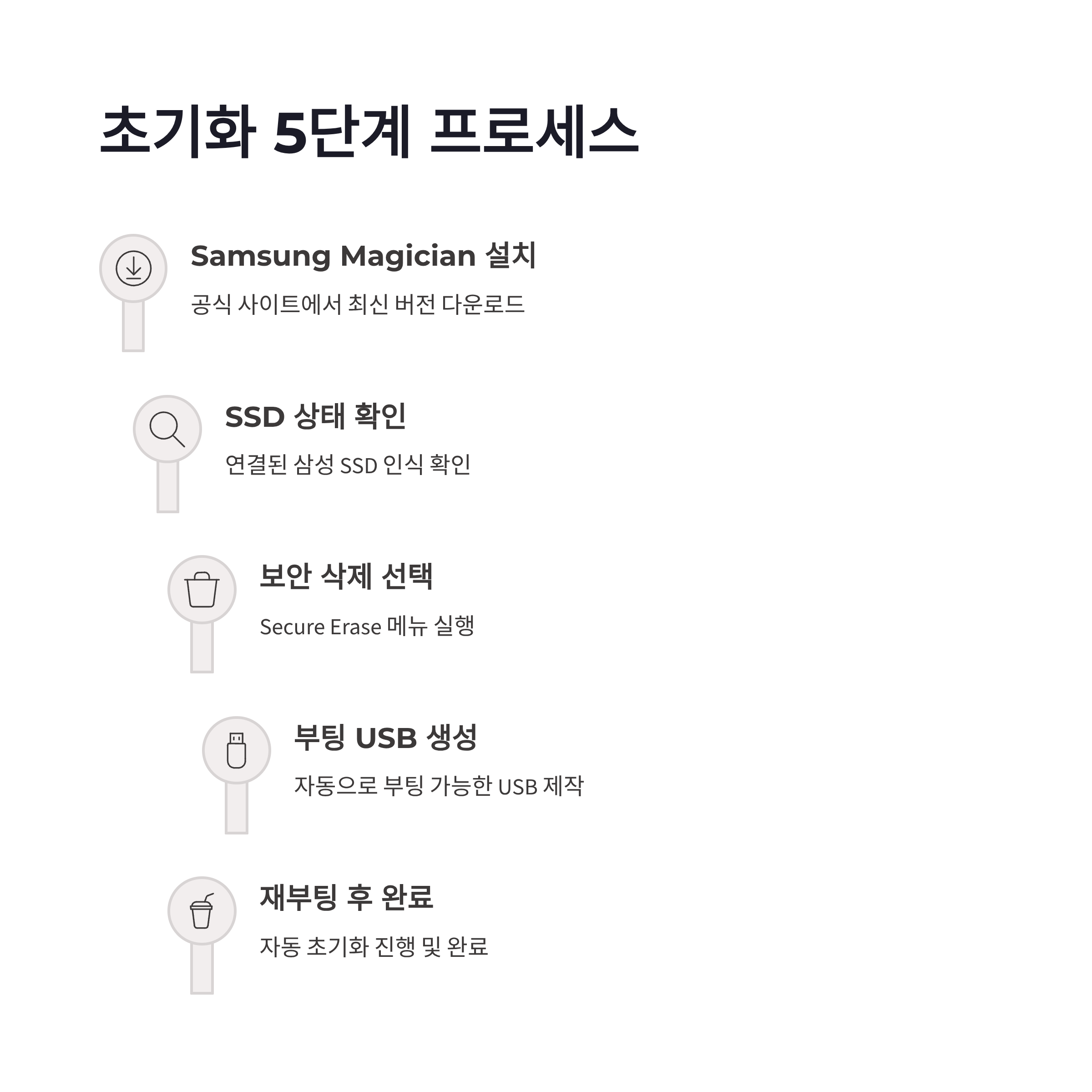 1. Samsung Magician 설치 2. SSD 상태 확인 3. 보안 삭제(Secure Erase) 선택 4. 부팅용 USB 생성 5. 재부팅 후 자동 초기화