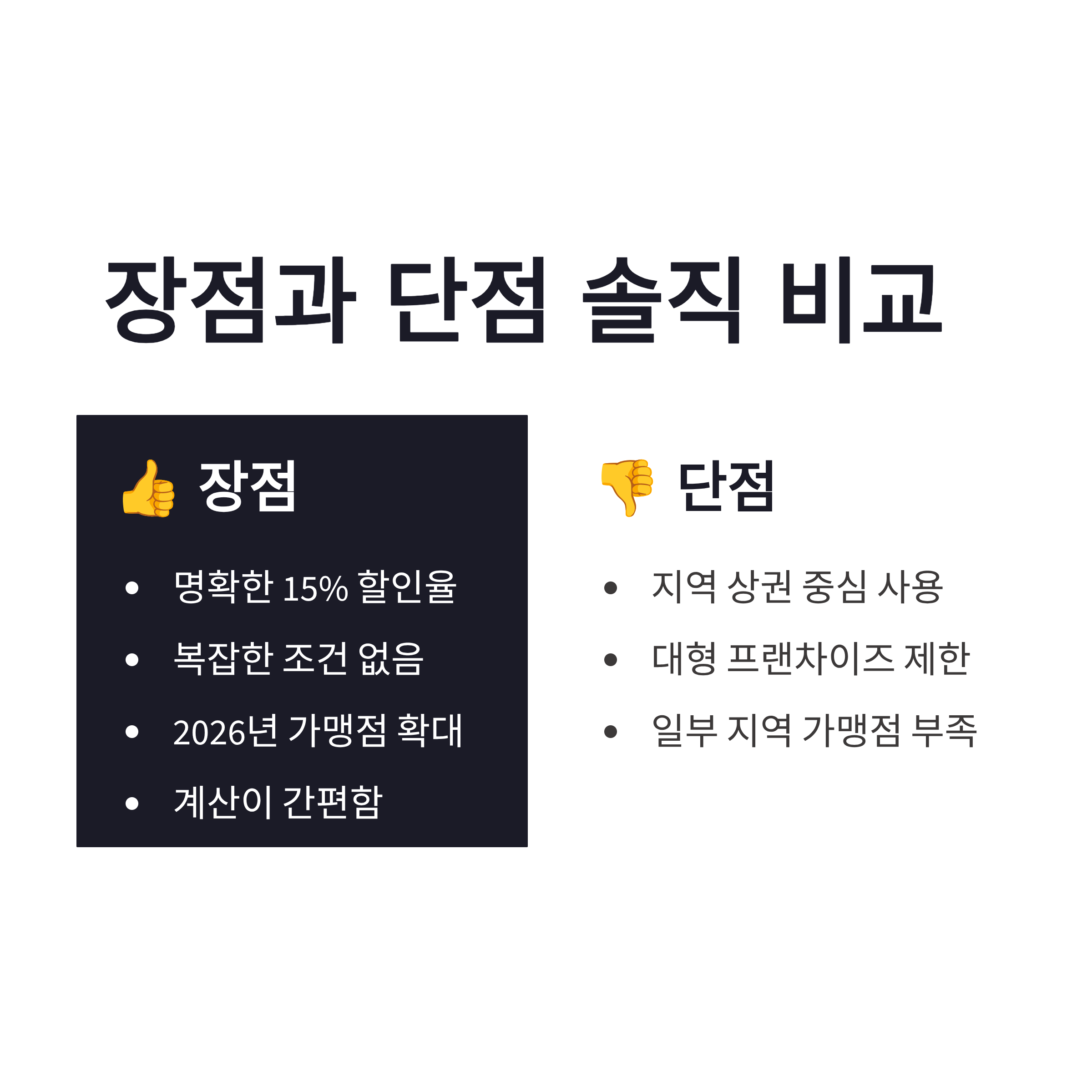 장점부터 말하면, 할인율이 명확합니다. 복잡한 조건 없이 구매할 때 바로 15% 할인되니까 계산하기도 편해요. 그리고 2026년 기준으로 가맹점도 꽤 늘어서 “여기선 안 돼요” 소리 들을 일도 줄었습니다. 단점이라면… 사용처가 지역 상권 중심이다 보니, 모든 곳에서 쓸 수는 없다는 점? 대형 프랜차이즈만 고집하면 아쉬울 수 있겠더라구요. 그래도 설 명절 구조상 전통시장 갈 일이 많아서 저는 크게 불편하진 않았습니다.