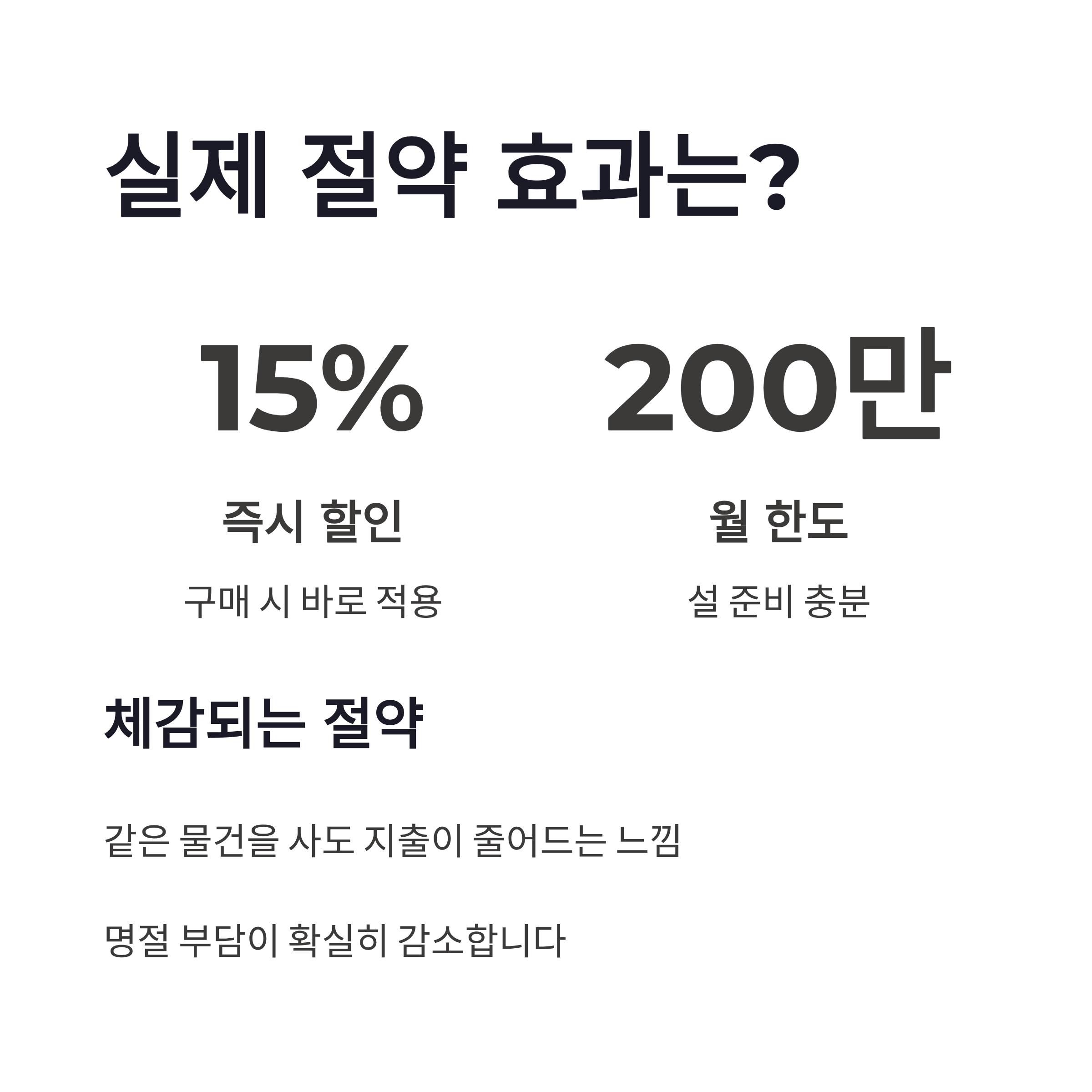 | 할인율 | 최대 15% | 바로 체감되는 장보기 절약 |