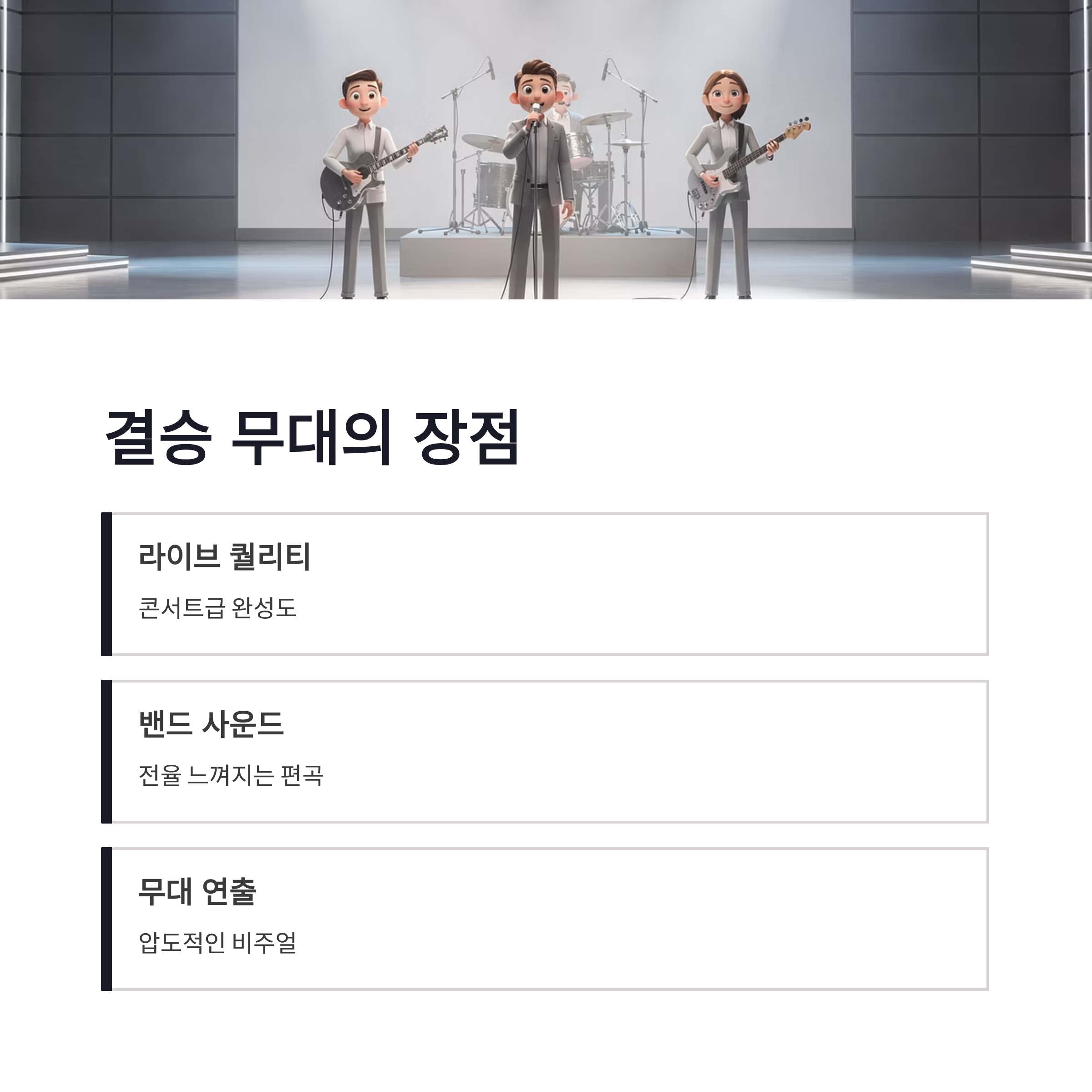 | 심사위원 점수 | 약 50% | 라이브 완성도, 표현력 중심 |