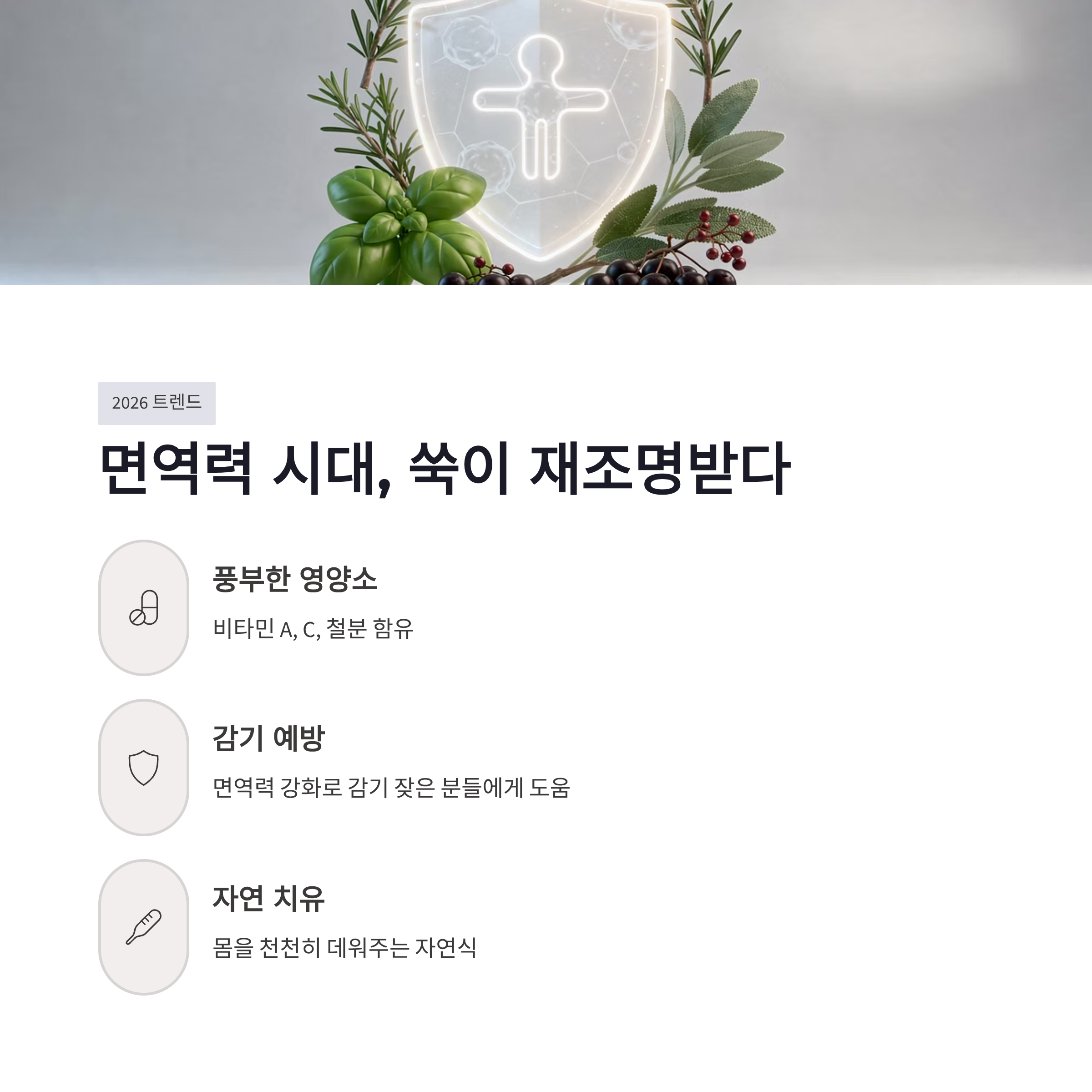 2026년 들어 건강 키워드가 다시 ‘면역력’으로 돌아오면서 쑥이 재조명받는 느낌이에요. 쑥에는 비타민 A, C, 철분이 들어 있어서 감기 잦은 분들한테 도움 될 수 있어요. 장점은 몸을 천천히 데워주는 자연식이라는 점이고, 단점은 과하게 먹으면 속이 쓰릴 수 있다는 거예요. 특히 열 많은 체질이나 위가 예민한 분들은 쑥 효능만 보고 무작정 많이 먹으면 오히려 탈 날 수 있겠더라구요. 요즘은 쑥환, 쑥 분말처럼 간편 제품도 많아졌지만 저는 자연 그대로가 제일 낫다고 느꼈어요.