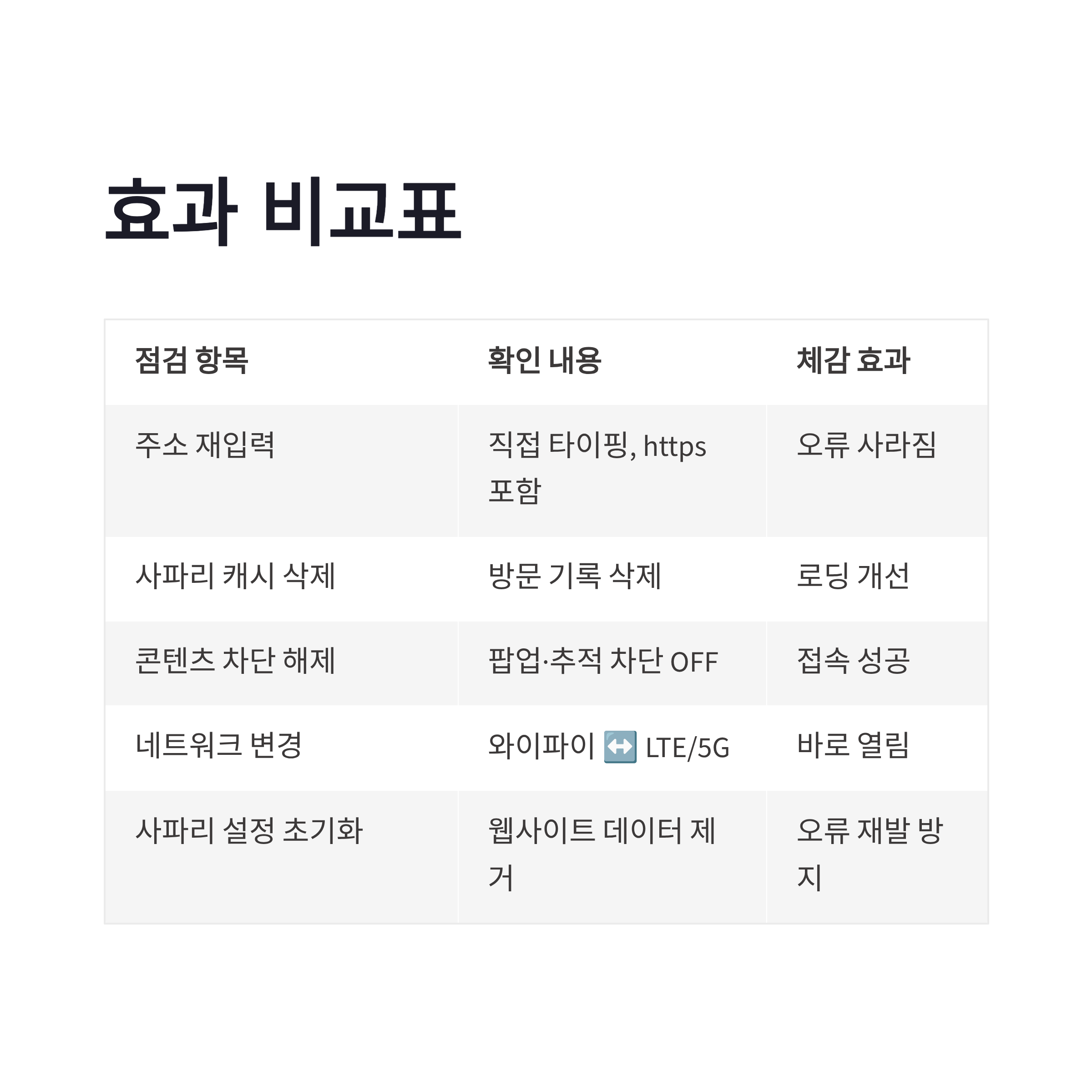 | 콘텐츠 차단 해제 | 팝업·추적 차단 잠시 OFF | 접속 성공 |