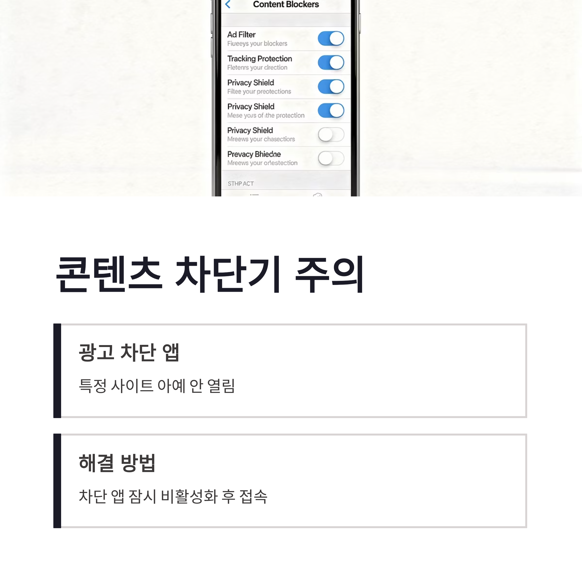 특히 콘텐츠 차단기 켜져 있으면 특정 사이트는 아예 안 열리더라구요. 저도 광고 차단 앱 때문이었음… 이건 진짜 의외였어요.
