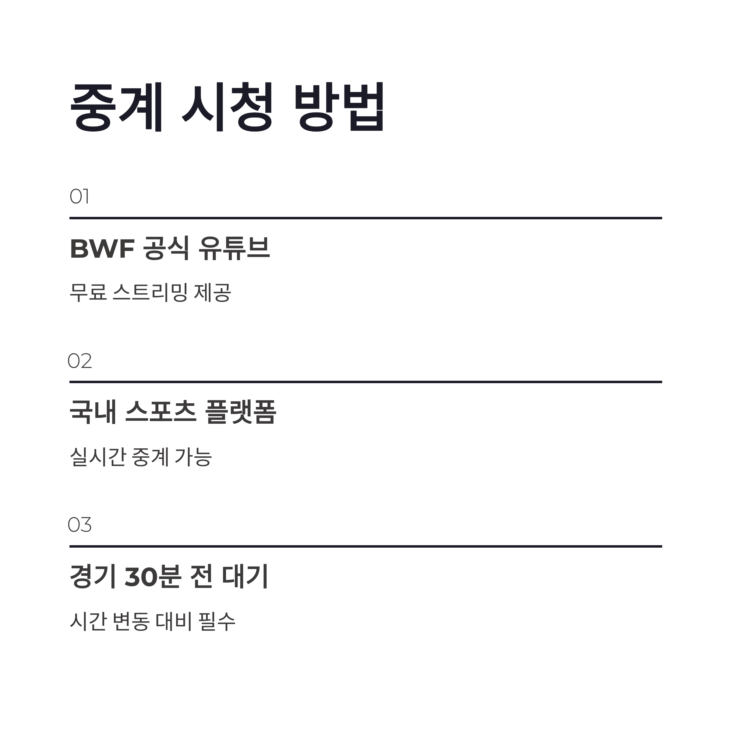 실제 경기 시간은 앞 경기 진행 상황에 따라 조금씩 달라질 수 있어서, 안세영 경기중계 일정 시간은 최소 30분 전부터 대기하는 게 마음 편하더라구요. 저도 항상 그렇게 챙겨봅니다.