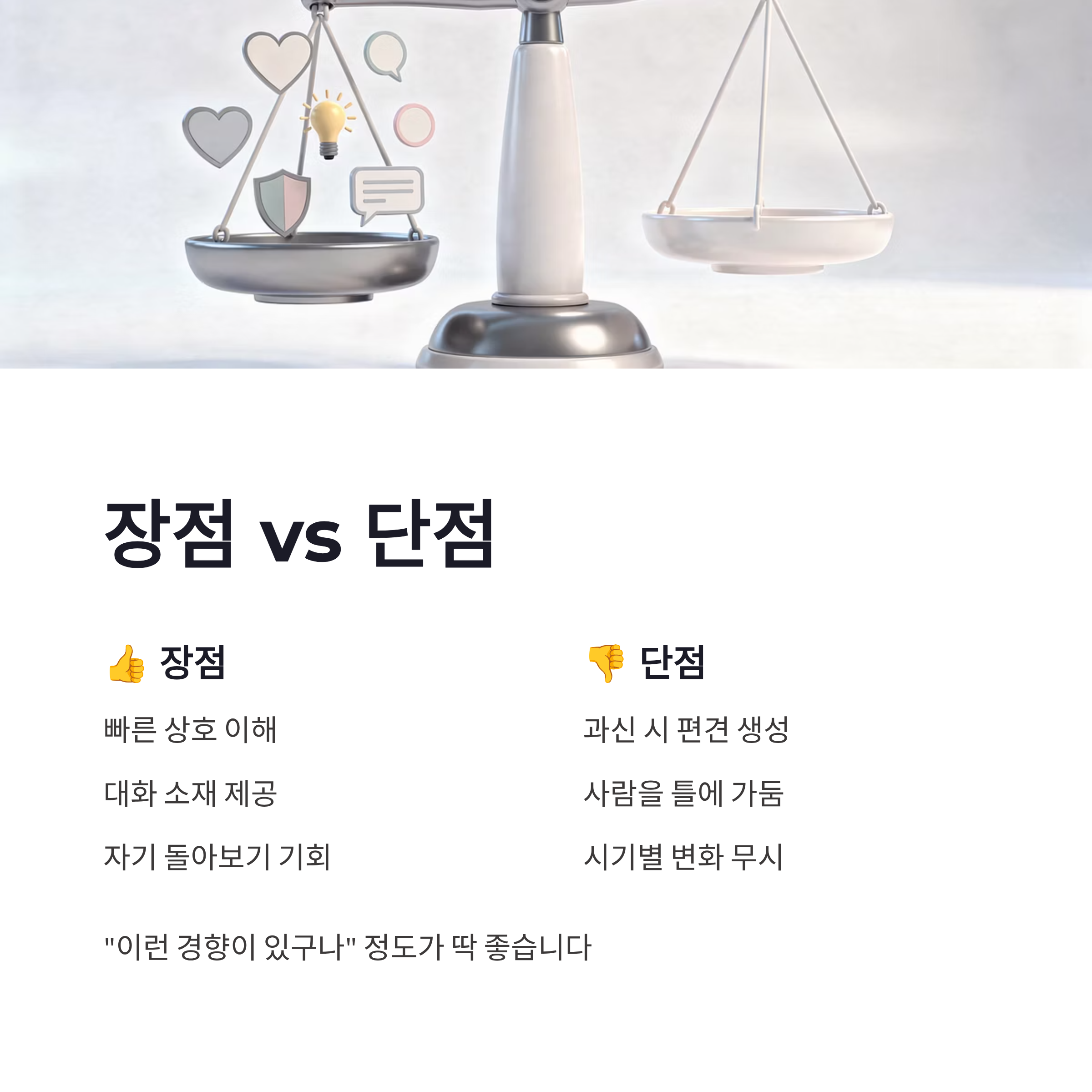 요즘 2026년 기준으로 보면, MBTI를 성격 규정 도구라기보단 대화 참고서 정도로 쓰는 분위기예요. 실제로 심리 쪽에서도 MBTI는 성향 경향을 보는 도구지, 성격을 고정하는 기준은 아니라고 하더라구요. 저도 엠비티아이 검사 결과가 상황이나 시기에 따라 조금씩 바뀌는 걸 여러 번 경험했구요. 장점은 빠르게 서로를 이해하는 데 도움 된다는 점, 단점은 너무 믿으면 사람을 틀에 넣게 된다는 거… 이게 좀 위험합니다 ㅠㅠ 그래서 저는 “아 이런 경향이 있구나” 정도로만 받아들이는 편이 제일 편하더라구요. 그 정도가 딱 좋슴다.