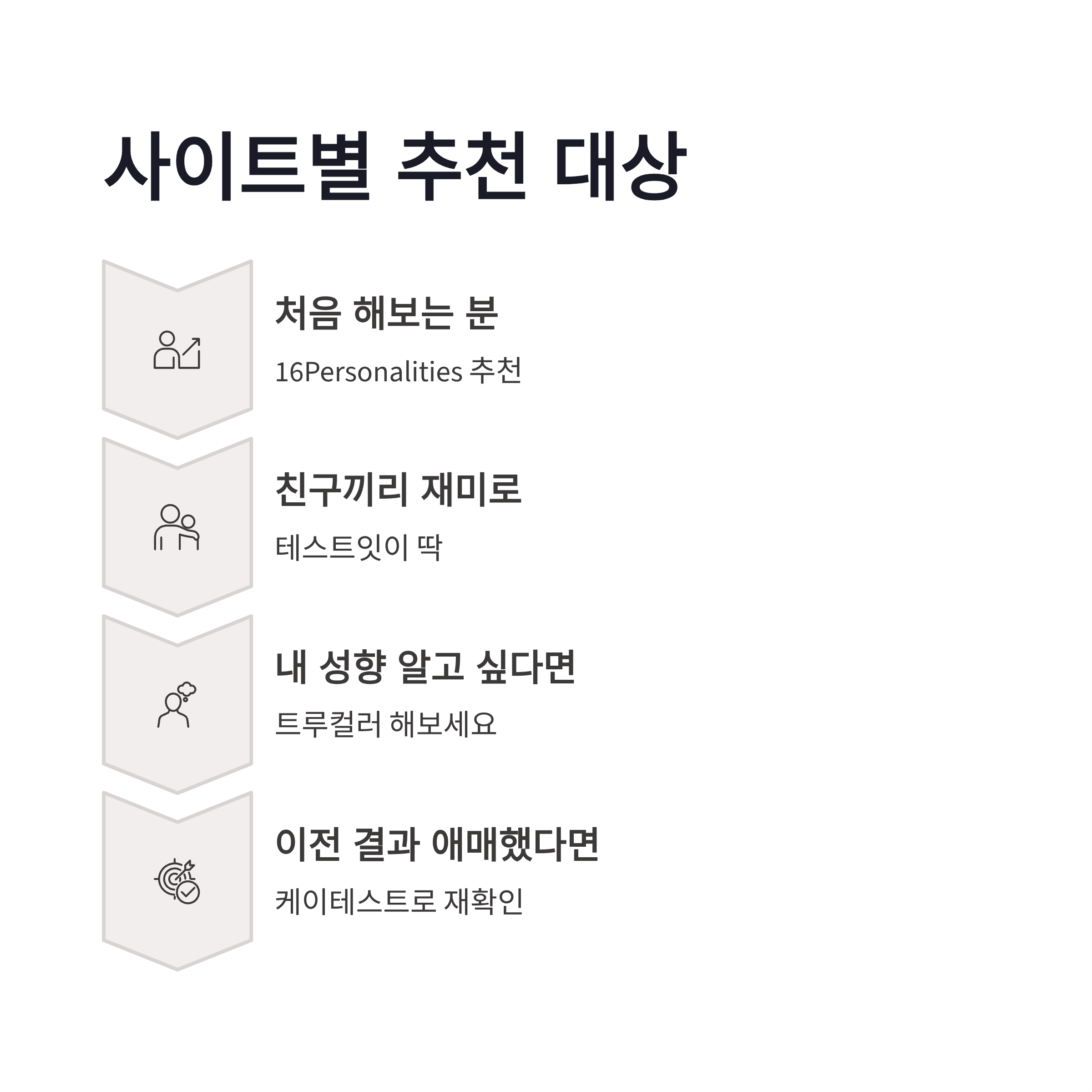 | 테스트잇 MBTI | 빠르고 가벼움, 결과 공유용 좋음 | 약 5분 | 친구끼리 재미로 |