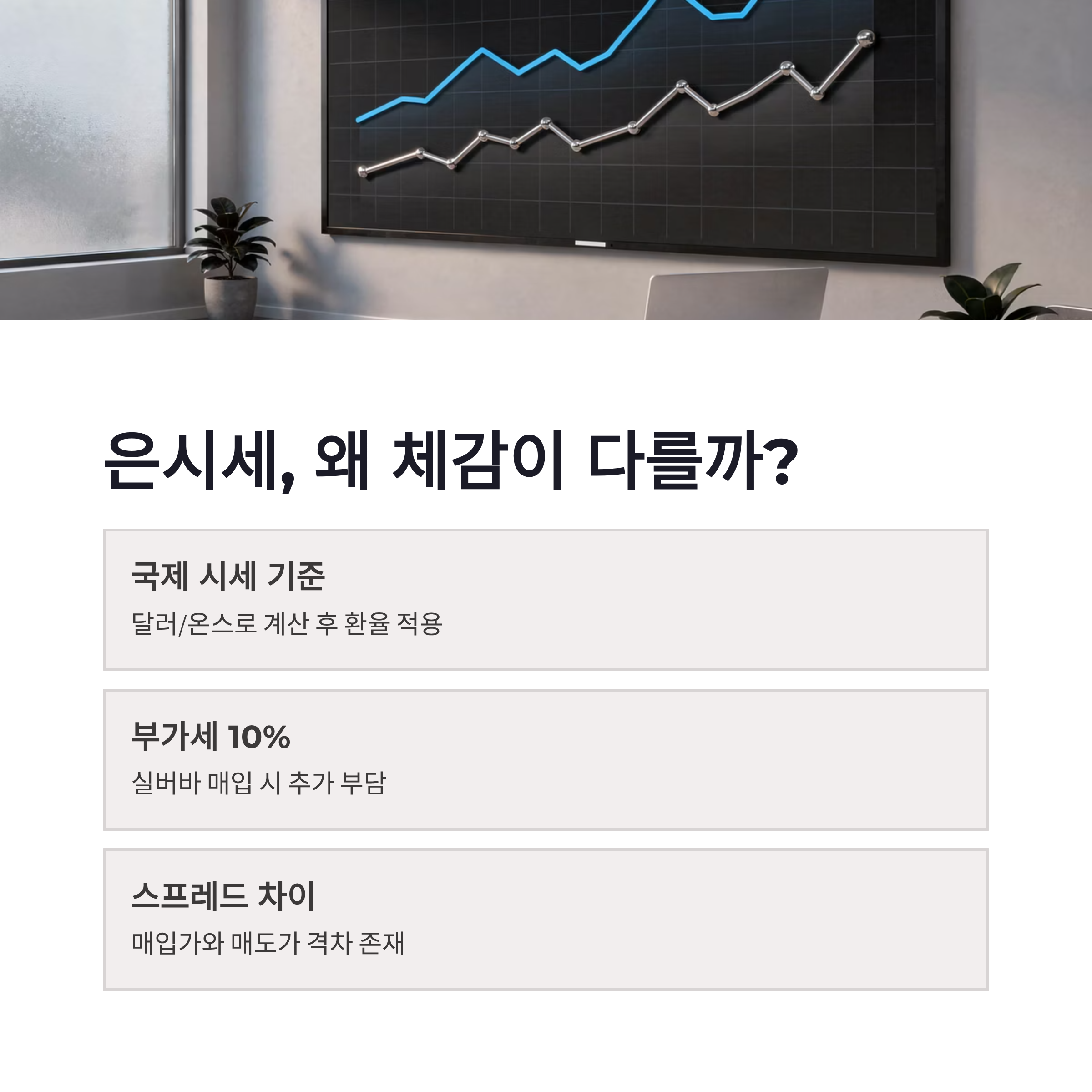 은을 살 때 기준은 단순해 보이지만 은근히 함정이 많습니다. 국제 시세 그대로 사는 게 아니라는 점이 핵심이에요. 실버바는 기본적으로 부가세 10% 포함이라서 체감가가 확 뛰거든요. 저도 처음 살 때 “이 정도였나?” 하면서 다시 계산기 두드렸던 기억이 납니다.