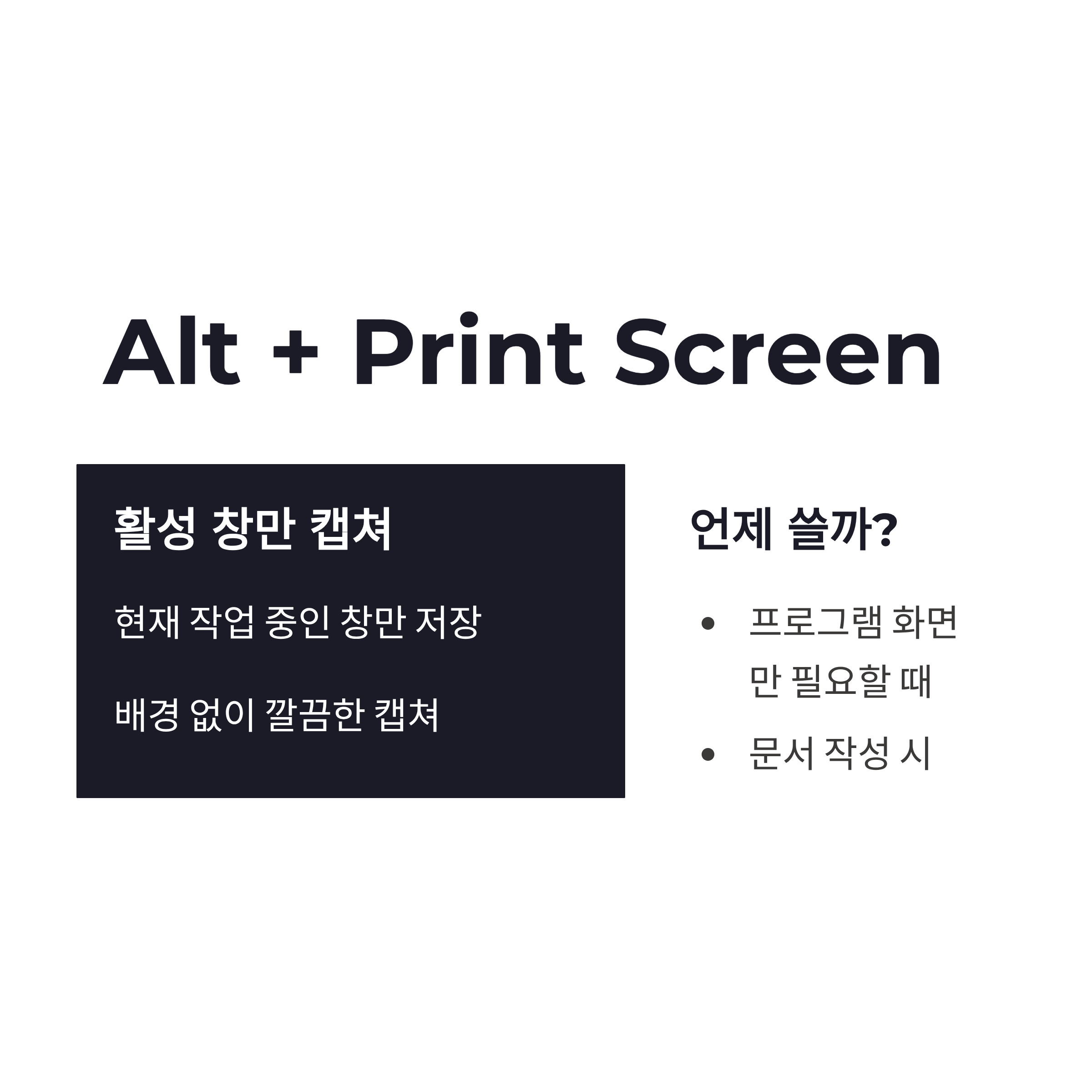 | Alt + Print Screen | 활성 창만 | 클립보드 |