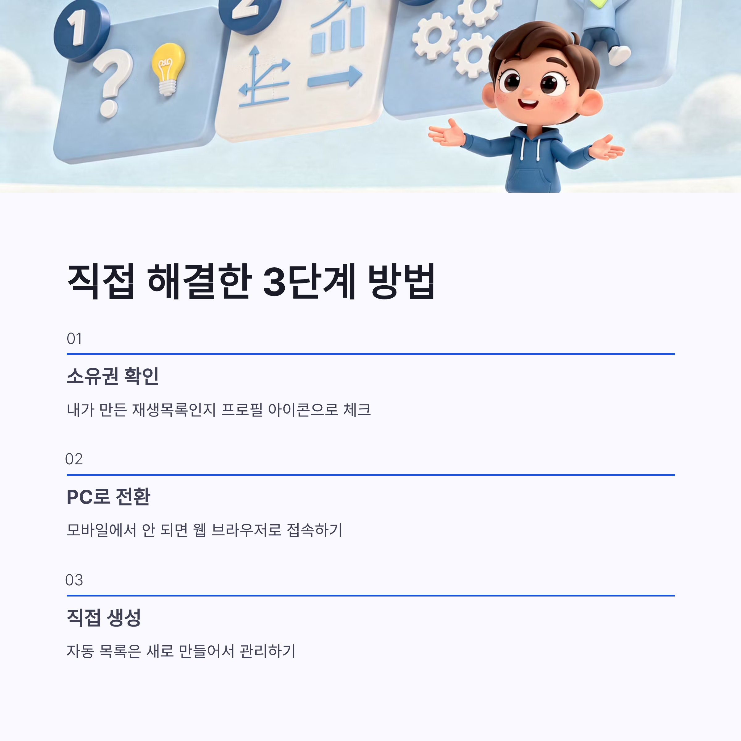 정리하면 유튜브 뮤직 재생목록 수정 안됨은 오류가 아니라 구조 문제인 경우가 대부분이에요. ✔ 내가 만든 재생목록인지 확인 ✔ 모바일에서 안 되면 PC로 접속 ✔ 자동 생성 목록은 수정 불가 이 세 가지만 기억하면 됩니다. 저처럼 괜히 앱 지웠다 깔았다 하지 마시구요 ㅋㅋ 유튜브 뮤직 재생목록 수정 안됨 때문에 답답했다면, 오늘 정리한 방법으로 한 번에 해결해보세요. 생각보다 허무하게 풀리더라구요!