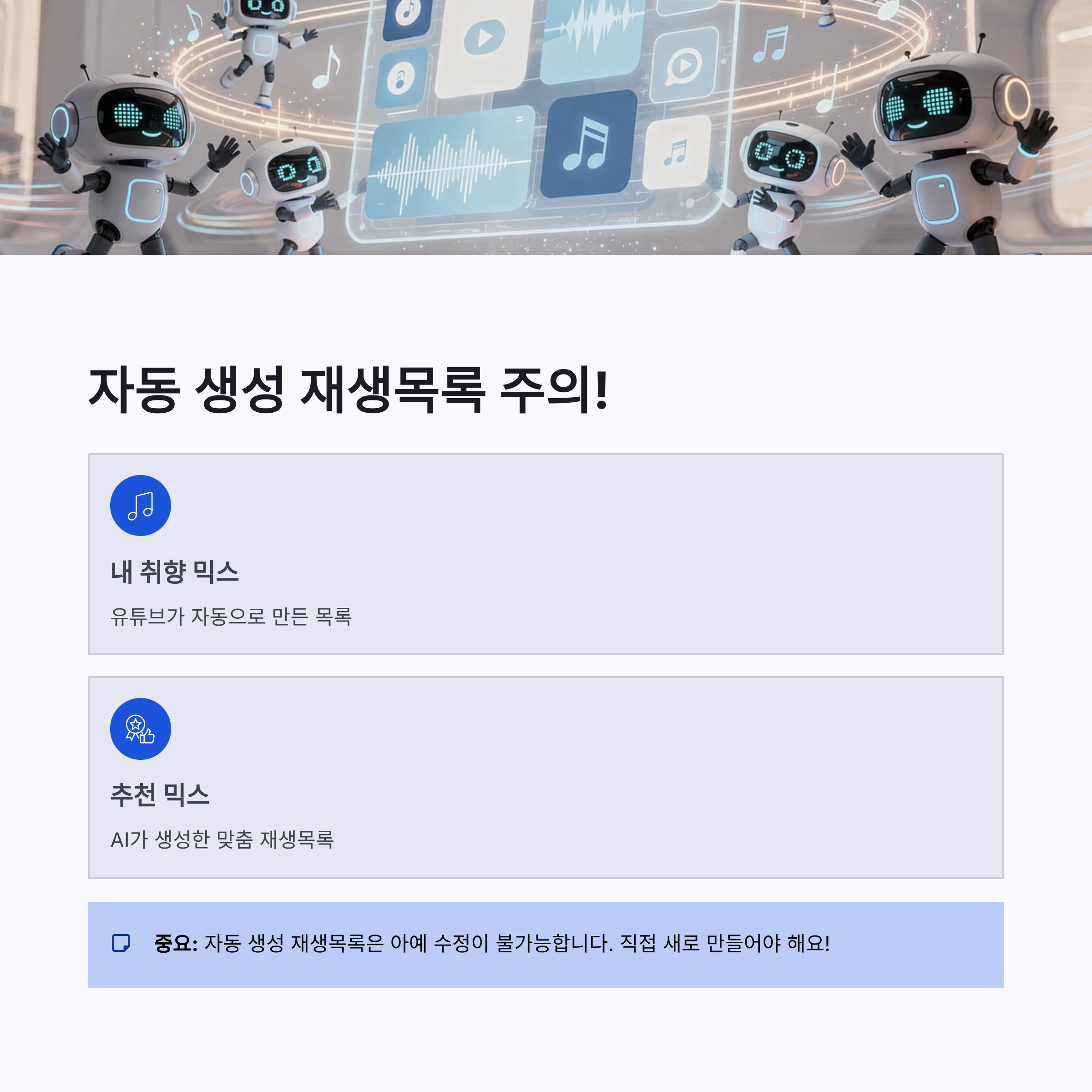 2025년 이후부터 유튜브 뮤직 UI가 자주 바뀌면서, 수정 버튼 위치도 조금씩 달라졌어요. 특히 자동 생성 재생목록(내 취향 믹스, 추천 믹스)은 아예 수정 불가입니다. 장점은 추천 정확도가 좋아졌다는 점, 단점은 내가 직접 손댈 수 없다는 점이구요. 그래서 저는 중요한 재생목록은 꼭 직접 새로 만들어서 관리합니다. 이게 유튜브 뮤직 재생목록 수정 안됨 스트레스 줄이는 팁이에요.