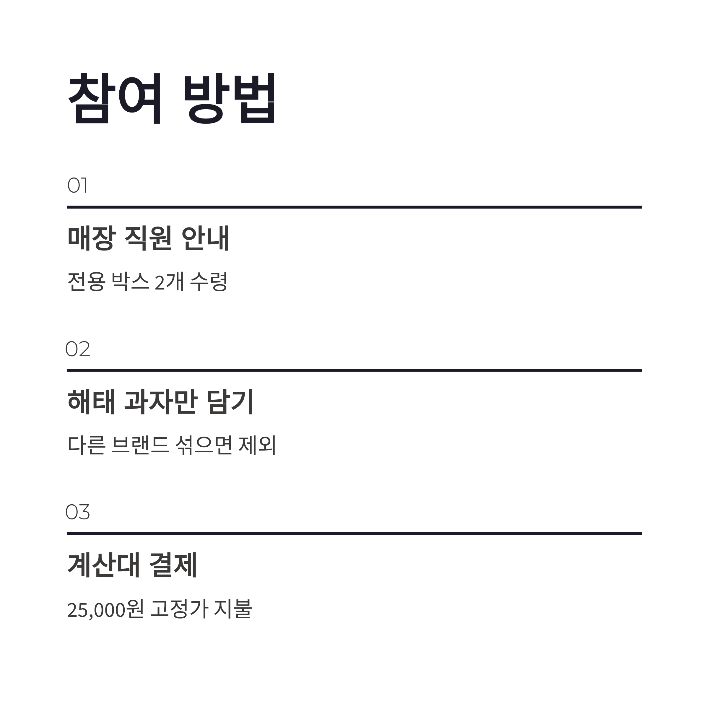 참여 방법은 어렵지 않습니다. 매장 직원 안내 받고 전용 박스 2개를 받아서, 해태 과자만 담으면 끝이에요. 다른 브랜드 섞으면 계산대에서 제외될 수 있으니 이건 꼭 주의해야 하구요. 구성 품목은 매장별로 조금씩 달랐습니다. 제가 본 기준으로는 홈런볼, 오예스, 버터링, 포키, 에이스 같은 해태 인기 과자들이 주력이었어요. 아래 표로 한 번 정리해볼게요.