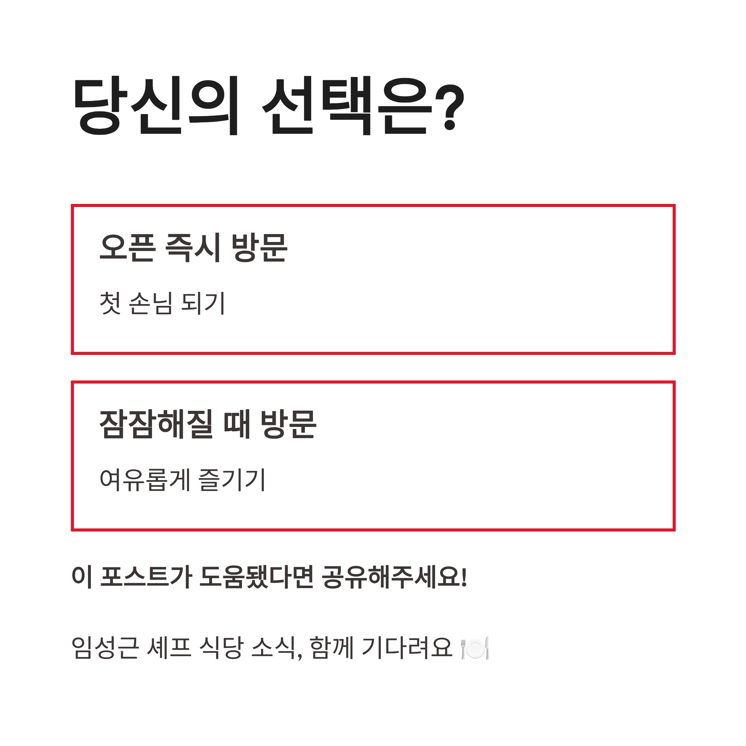 현재 임성근 셰프 식당 근황을 보면, 공식 주소나 예약 정보는 아직 공개 전이에요. 대신 인스타, 커뮤니티, 유튜브 댓글 쪽 반응은 진짜 뜨거워요. “열리면 무조건 간다”, “줄 서도 먹겠다” 이런 말이 괜히 나오는 게 아니더라구요. 장점은 분명해요. 검증된 실력, 방송으로 이미 맛 상상 완료 상태. 단점이라면… 오픈 초반엔 웨이팅 지옥일 가능성 ㅠㅠ 그래도 임성근 셰프 식당이라면 감수할 사람 많을 것 같아요.