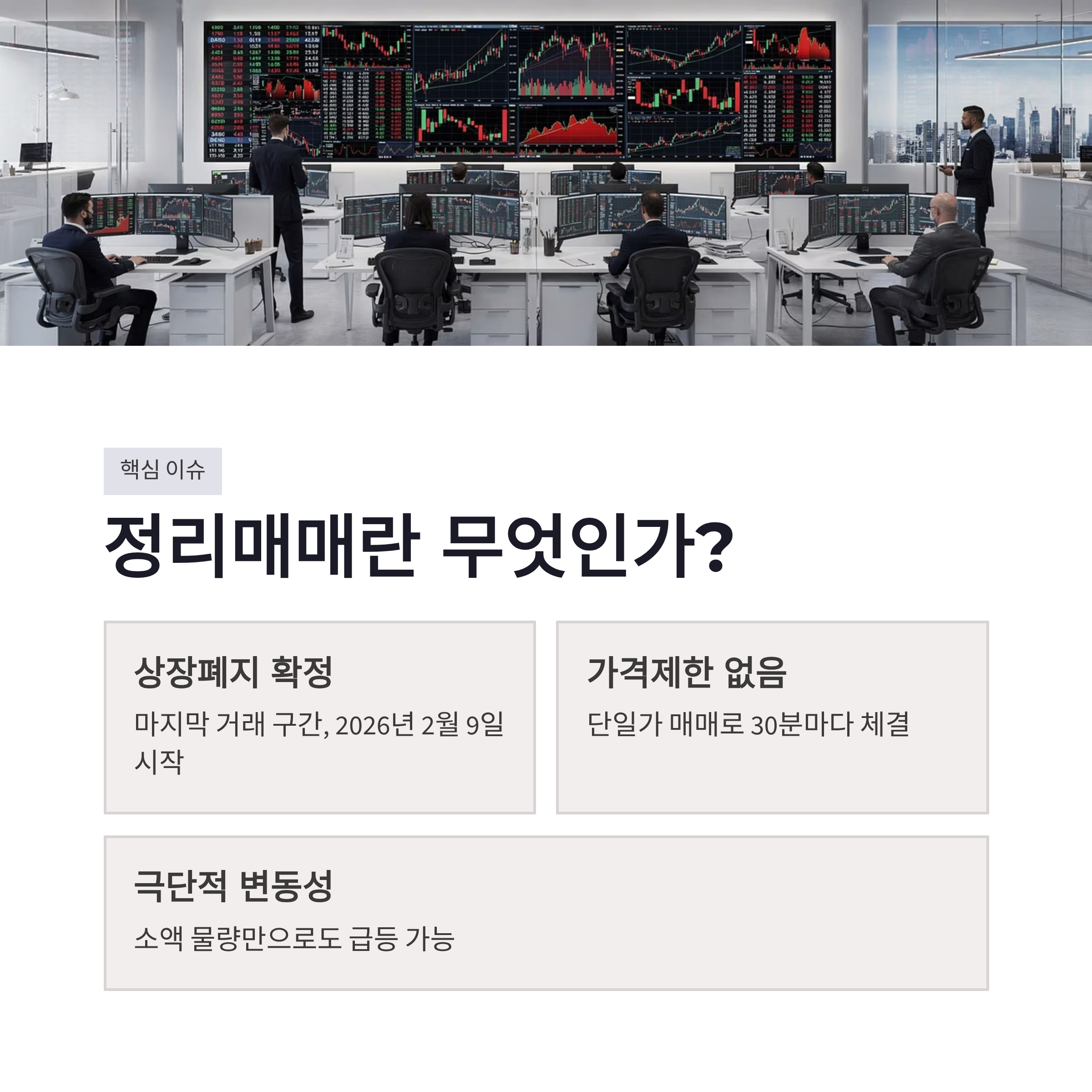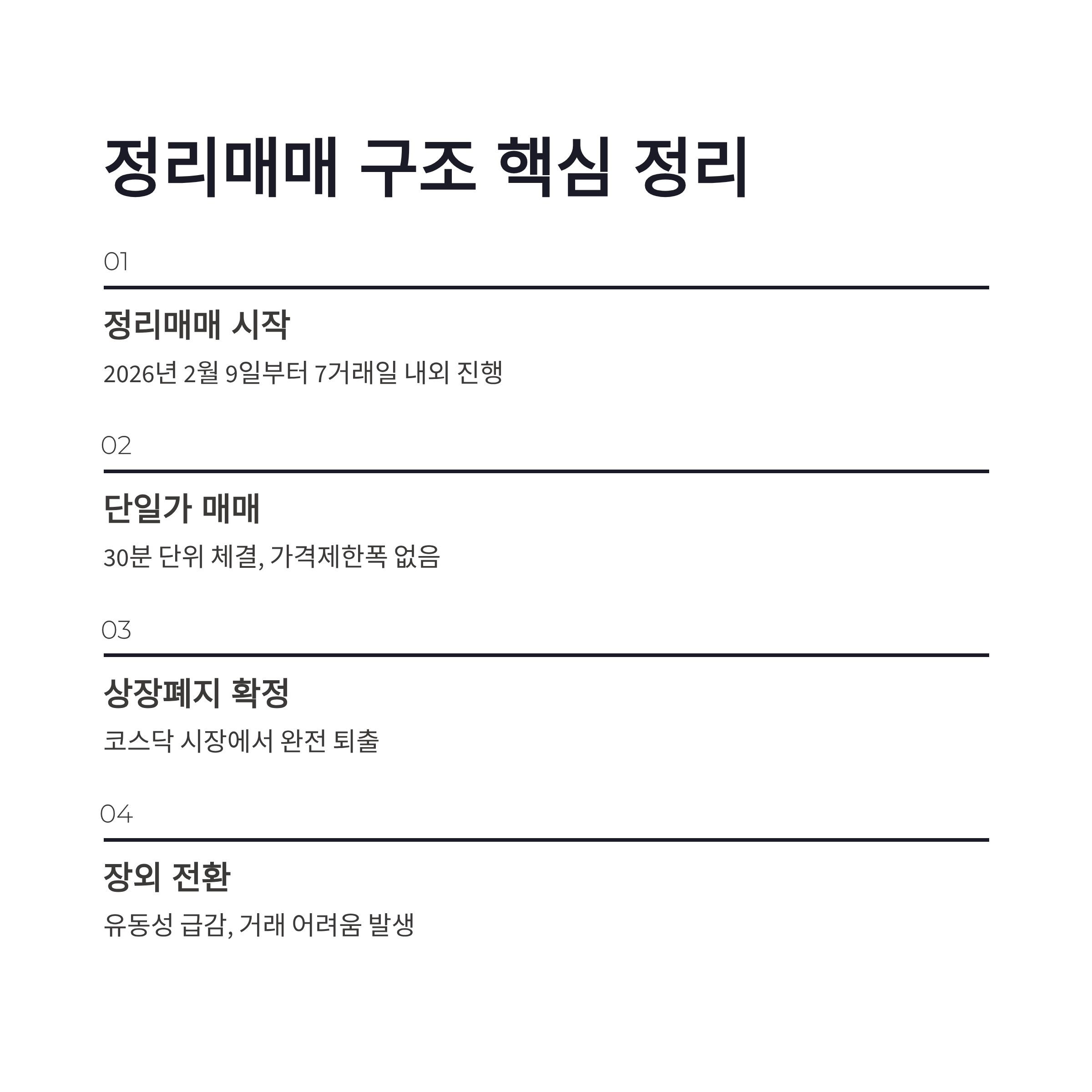 | 정리매매 시작 | 2026년 2월 9일 | 가격제한폭 없음 |