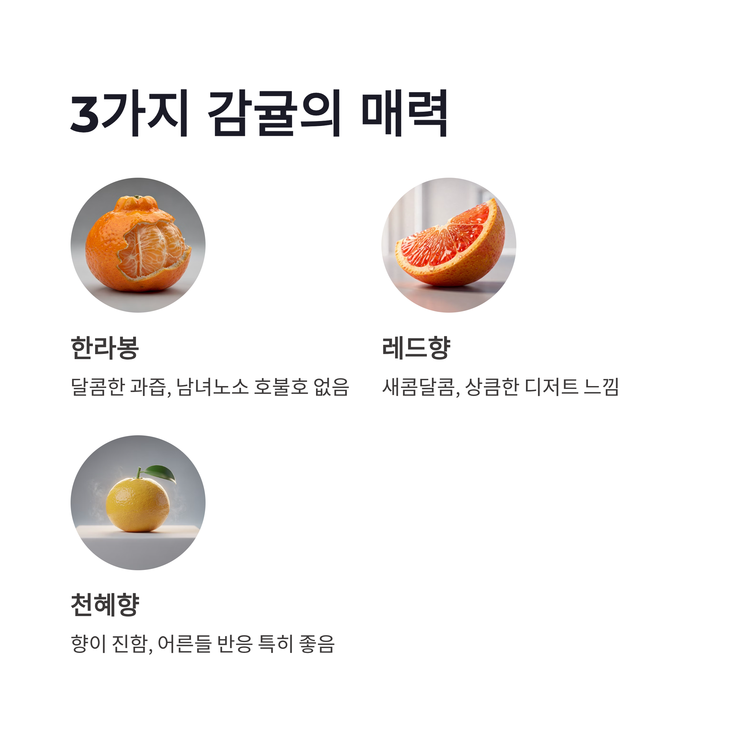 | 한라봉 | 달콤한 과즙 | 남녀노소 호불호 적음 |