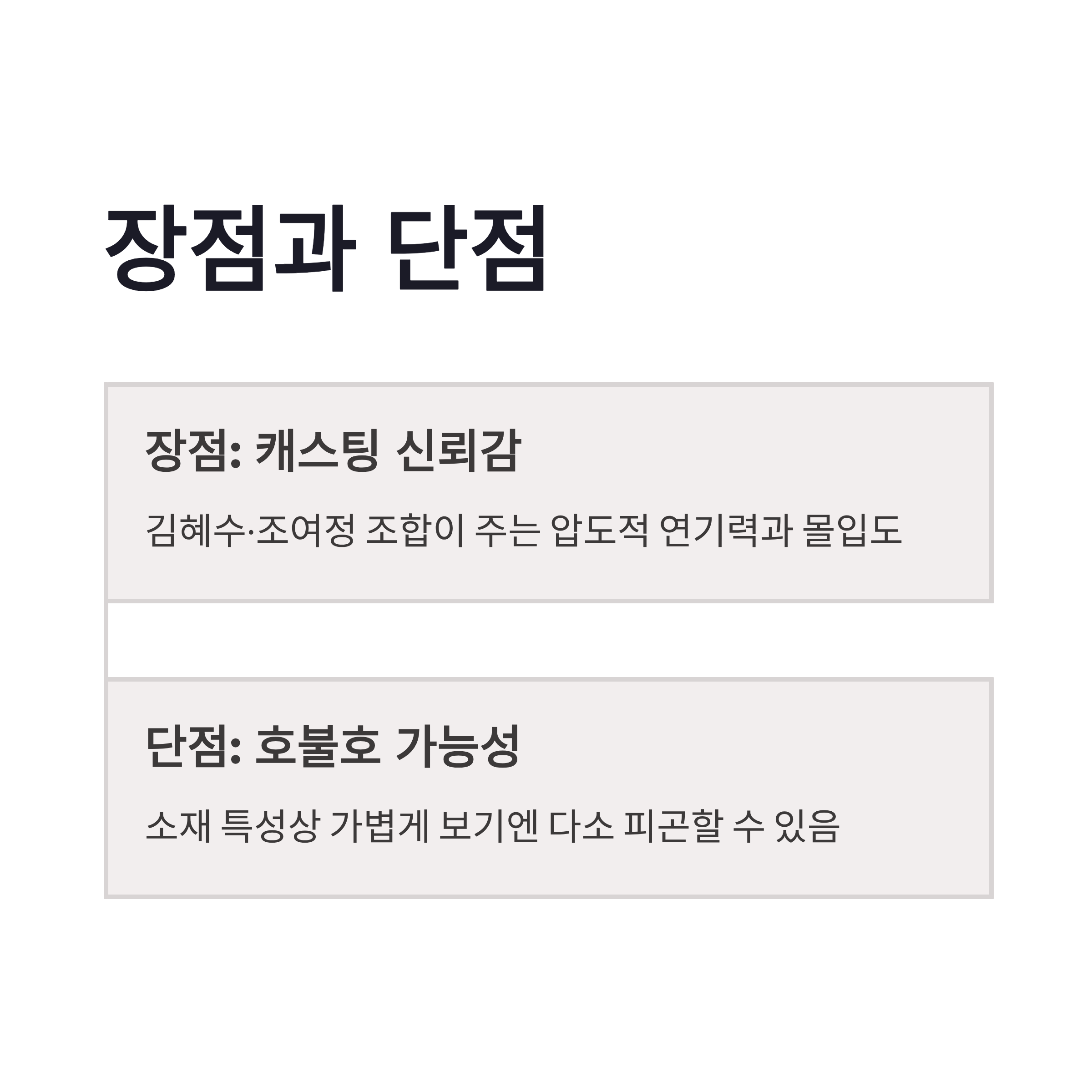 요즘 드라마들 보면 착한 이야기보다 불편한 이야기가 더 오래 남는 경우가 많잖아요. 지금 불륜이 문제가 아닙니다도 딱 그 결입니다. 장점부터 보면 캐스팅에서 오는 신뢰감이 압도적이라는 점. 특히 조여정은 이런 이중적인 캐릭터 진짜 잘 소화하는 배우라서 기대가 큽니다. 반대로 단점이라면, 소재 특성상 호불호가 갈릴 수 있다는 점 정도? 가볍게 보기엔 살짝 피곤할 수도 있겠다는 생각은 들었어요. 그래도 2026년 드라마 트렌드가 ‘불편하지만 웃긴 이야기’ 쪽으로 가고 있어서 흐름은 잘 탄 느낌이었습니다.