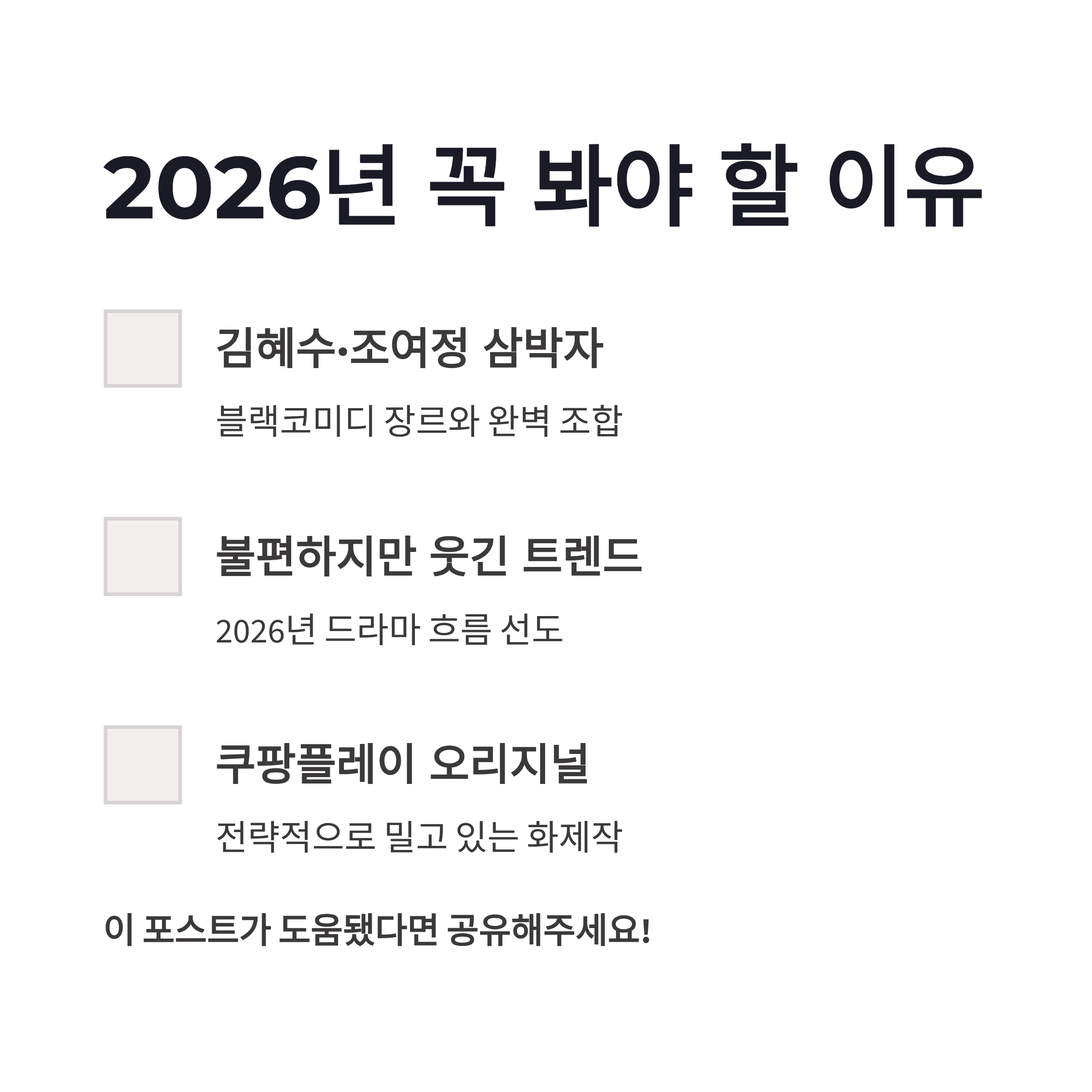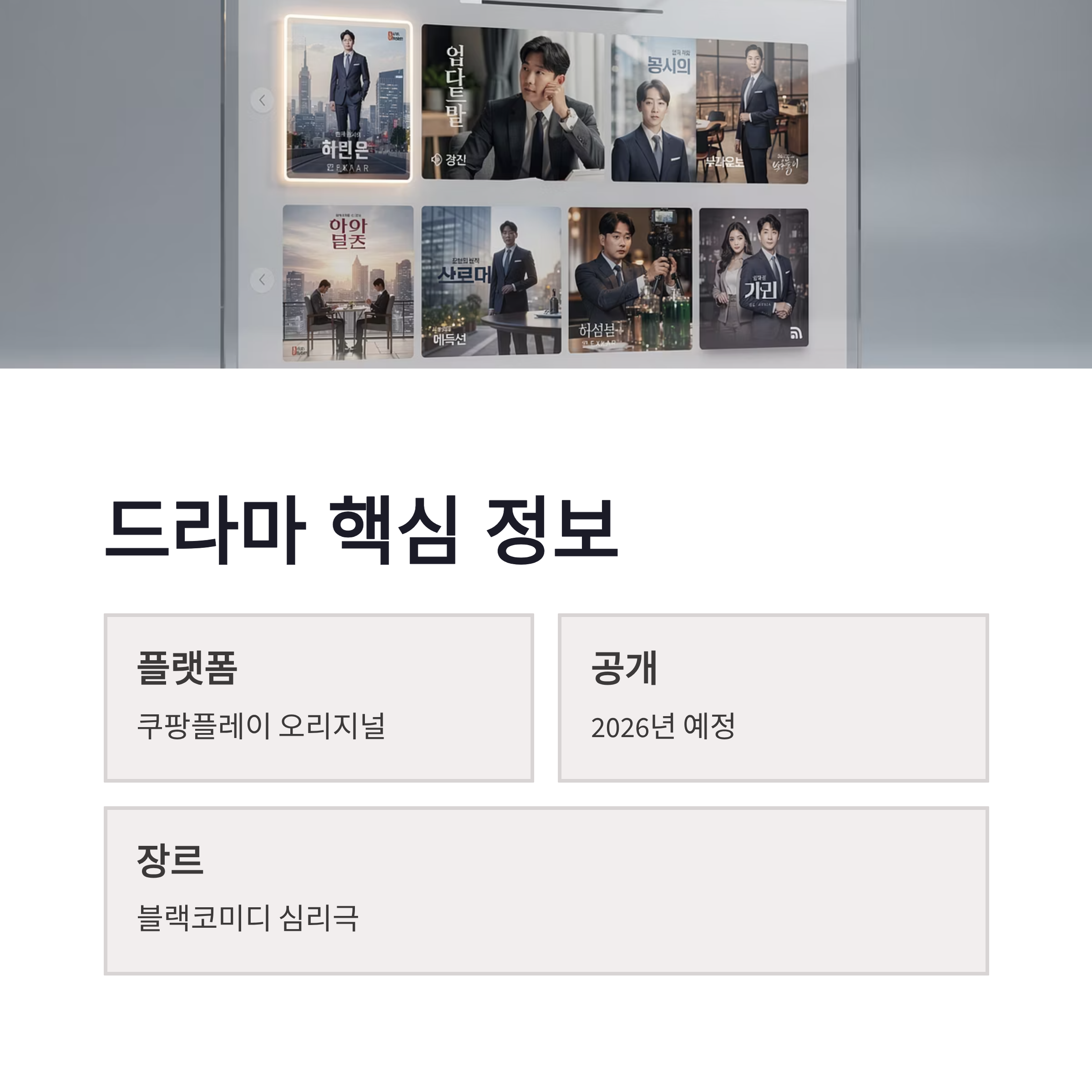 연관 키워드로는 쿠팡플레이 오리지널, 2026년 기대 드라마, 블랙코미디 드라마가 많이 언급되는데, 체감상 이미 화제성은 충분해 보였구요.