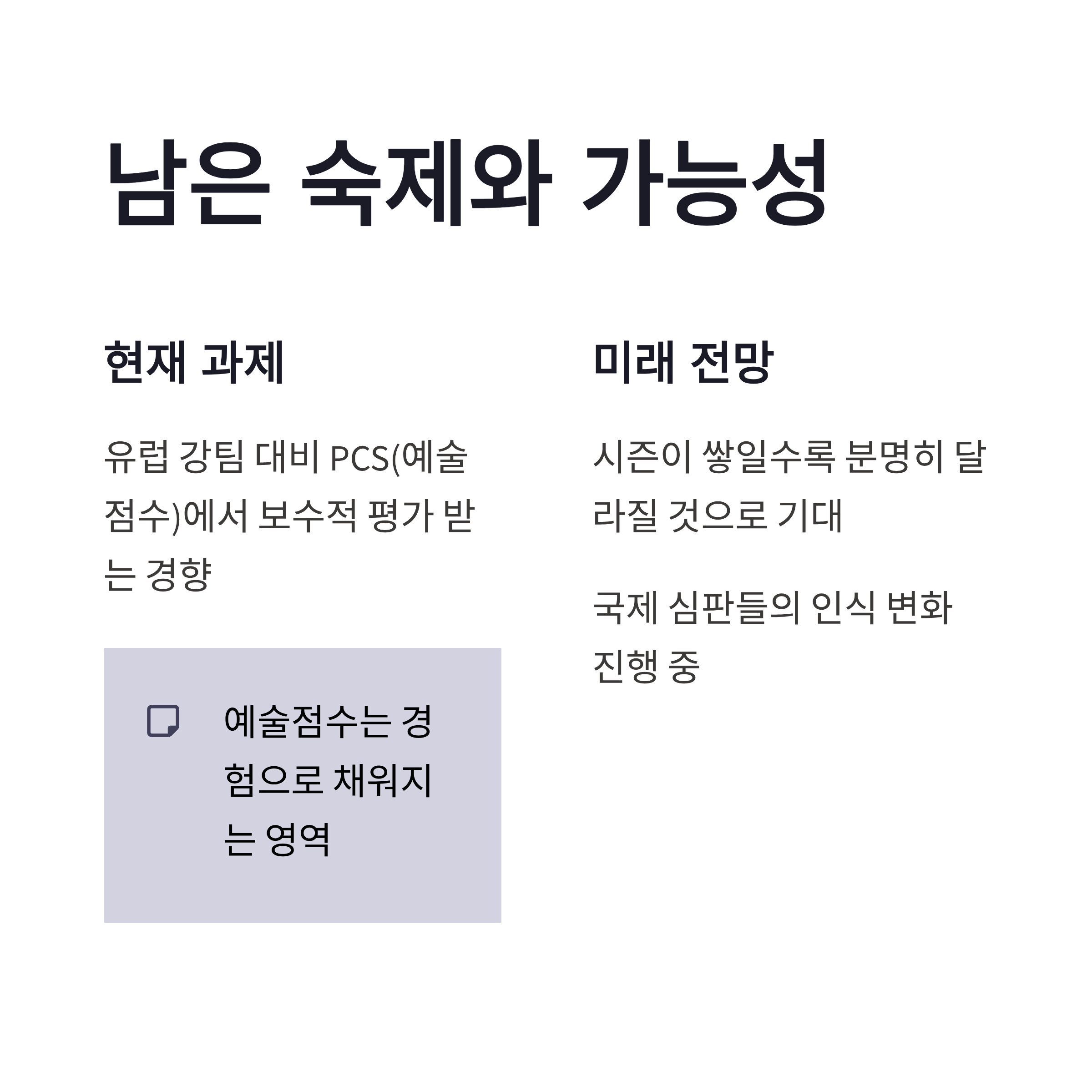 2026년 아이스댄스 트렌드는 확실합니다. 스토리텔링 + 음악 해석력 + 정확한 엣지. 기술만 잘해선 안 되고, 프로그램 전체가 하나의 서사처럼 흘러가야 하거든요. 이 점에서 콴예 임해나 아이스댄스는 꽤 앞서 있어요. 장점은 명확합니다. 리프트 안정성, 트위즐 동기화, 그리고 프로그램 후반까지 흐트러지지 않는 집중력. 반면 단점도 있어요. 유럽 강팀에 비해 PCS(예술점수)에서 보수적으로 평가받는 경향은 아직 숙제입니다. 그래도 이건 경험으로 채워지는 영역이라, 시즌이 쌓일수록 분명 달라질 거라 봅니다.