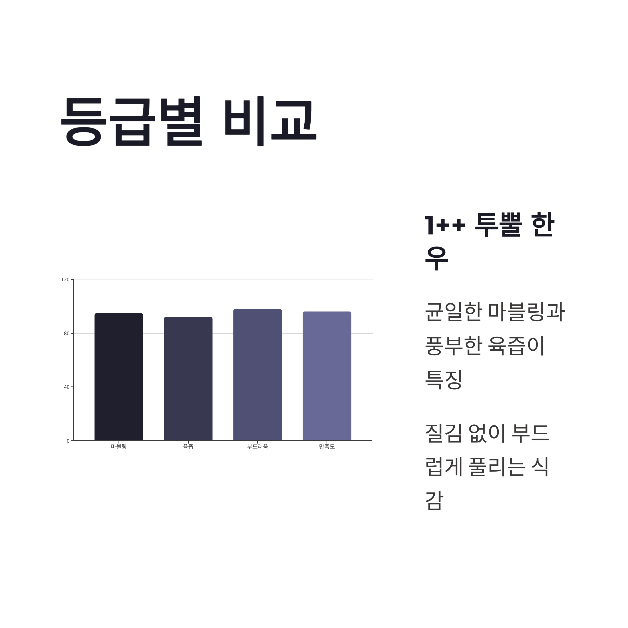 | 등급 | 1++ 투뿔 한우 | 마블링 균일, 육즙 풍부 |