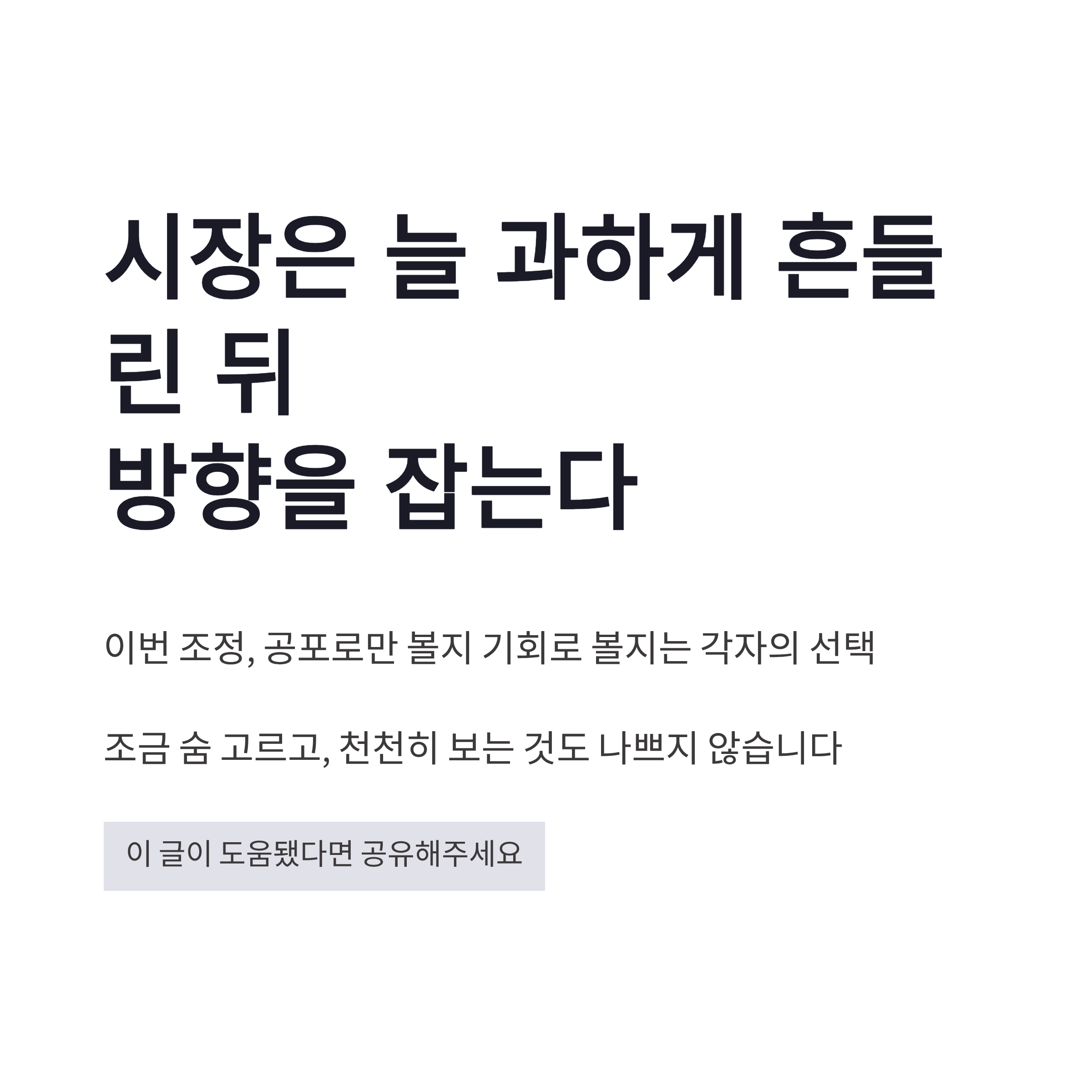 정리해보면 이번 코스피 급락은 트럼프 발언 → 연준 긴축 우려 → 글로벌 증시 동요 이 흐름이었구요. 단기적으로는 변동성 장세가 이어질 가능성이 큽니다. 그래서 전 개인적으로 현금 비중 점검, 과도한 추격 매수 자제, 이 두 가지만은 꼭 지키는 중이에요. 시장은 늘 과하게 흔들린 뒤에 방향을 잡더라구요. 이번 조정, 공포로만 볼지 기회로 볼지는 각자의 선택이겠쥬? 조금 숨 고르고, 한 박자 느리게 보는 것도 나쁘지 않다고 느꼈습니다.