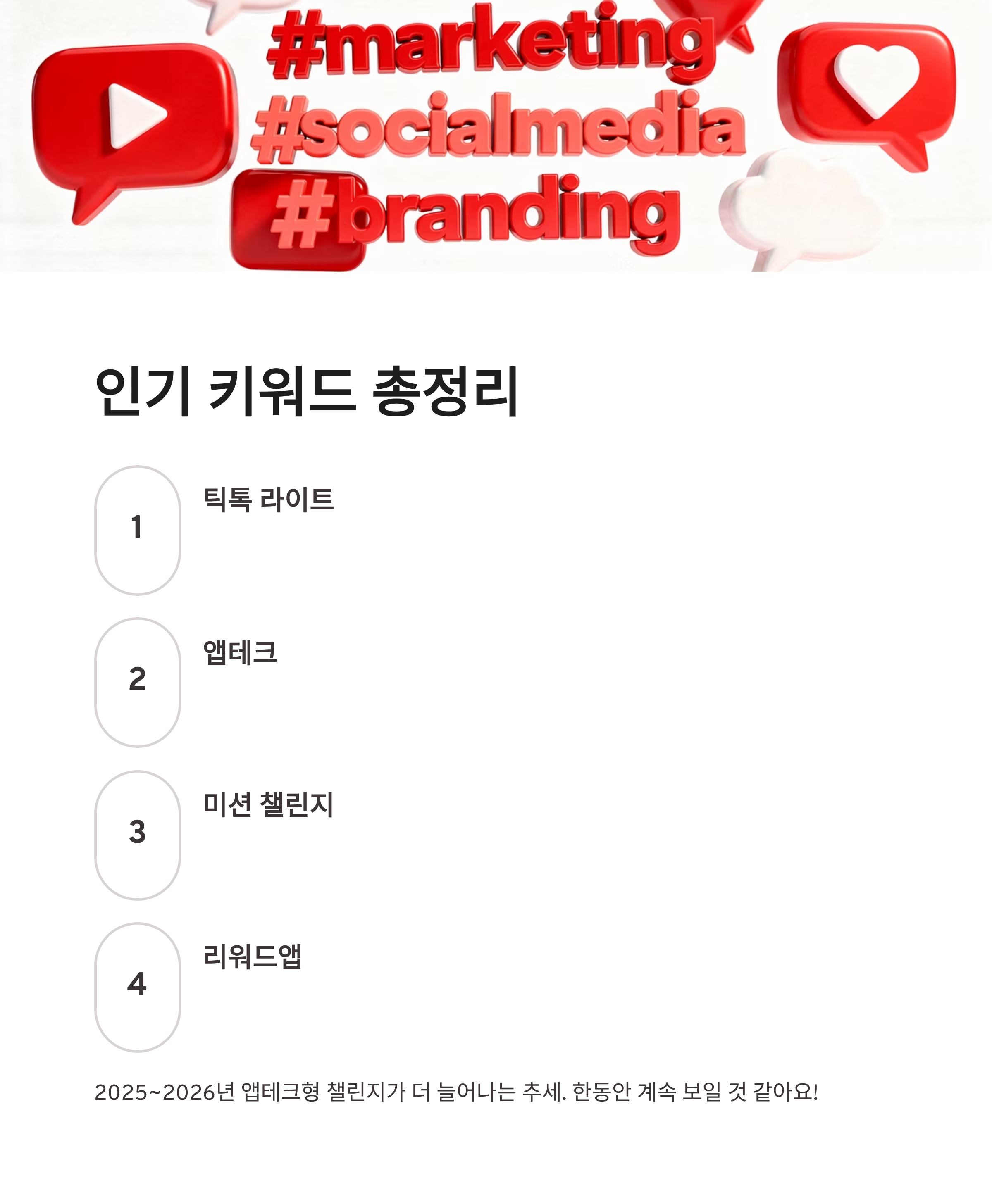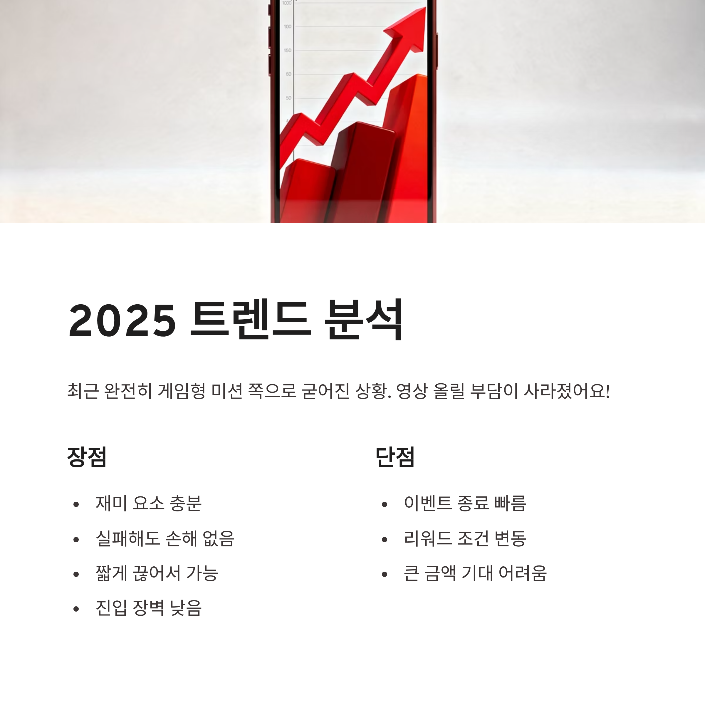 최근 틱톡 히트챌린지 트렌드는 “게임형 미션” 쪽으로 완전히 굳어진 느낌이에요. 예전처럼 영상 올려야 하는 부담이 없어서 진입이 쉬운 게 가장 큰 장점! 장점부터 말하자면 재미 요소 있음, 실패해도 손해 없음, 짧게 끊어서 가능. 반대로 단점은 이벤트 종료가 빠르다는 점, 그리고 리워드 조건이 가끔 바뀐다는 점 정도였어요. 그래도 2025~2026년 들어 이런 앱테크형 챌린지가 더 늘어나는 추세라 틱톡 히트챌린지는 한동안 계속 보일 것 같더라구요.