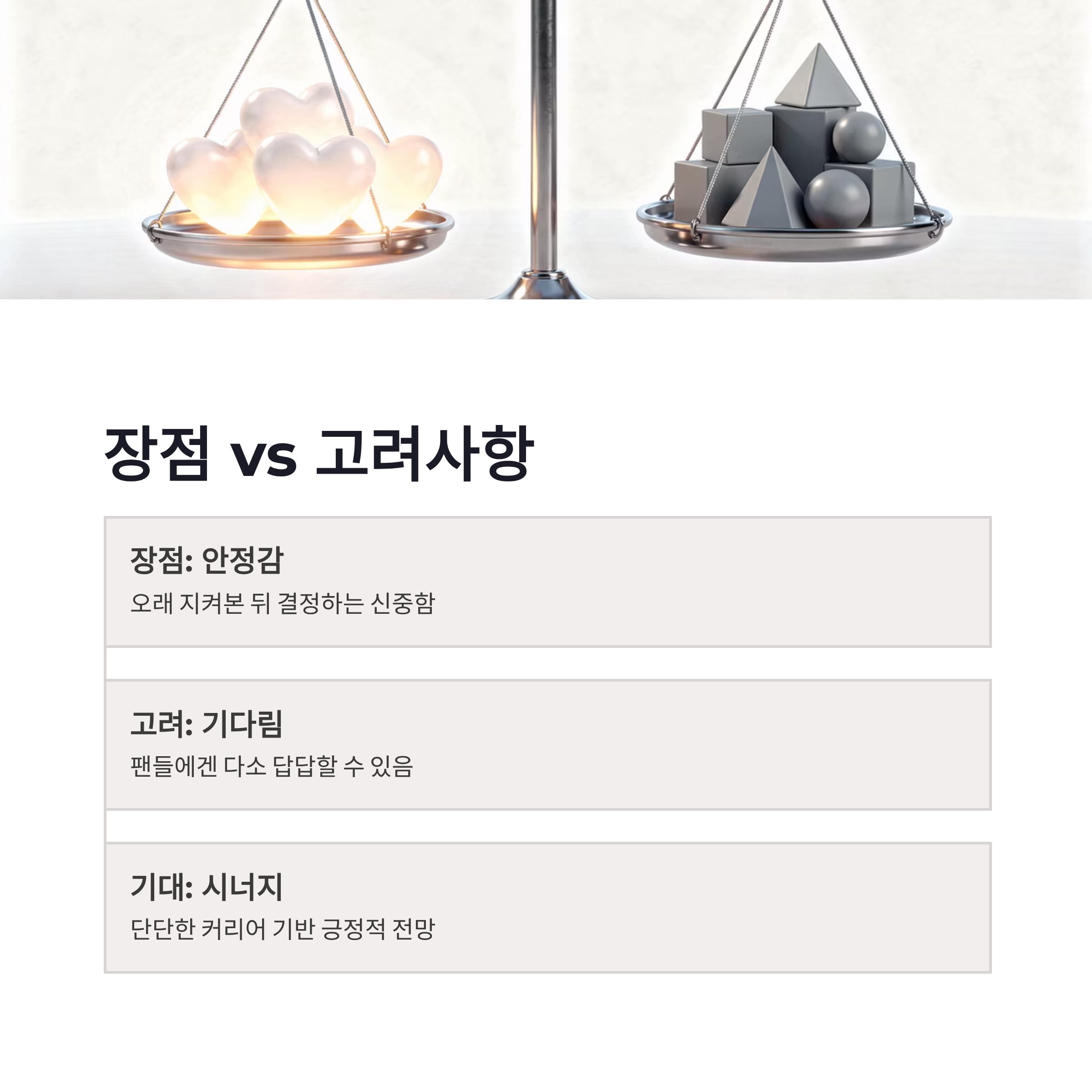 2026년 기준 연예계 분위기를 보면, 예전처럼 속도전보다는 충분히 고민하고 결정하는 선택이 더 응원받는 쪽이에요. 이 점에서 하정우 차정원 결혼 이야기는 요즘 흐름과 잘 맞아 보였습니다. 장점이라면 서로를 오래 지켜본 뒤 결정한다는 안정감이고, 단점이라면 기다리는 팬들 입장에선 살짝 답답할 수 있다는 점이겠죠 ㅎㅎ. 그래도 두 사람 모두 커리어가 단단해서, 만약 결혼으로 이어진다면 시너지에 대한 기대감도 꽤 큽니다. 과한 노출 없이 이어온 관계라는 점도 요즘 트렌드랑 묘하게 닮아 있구요.