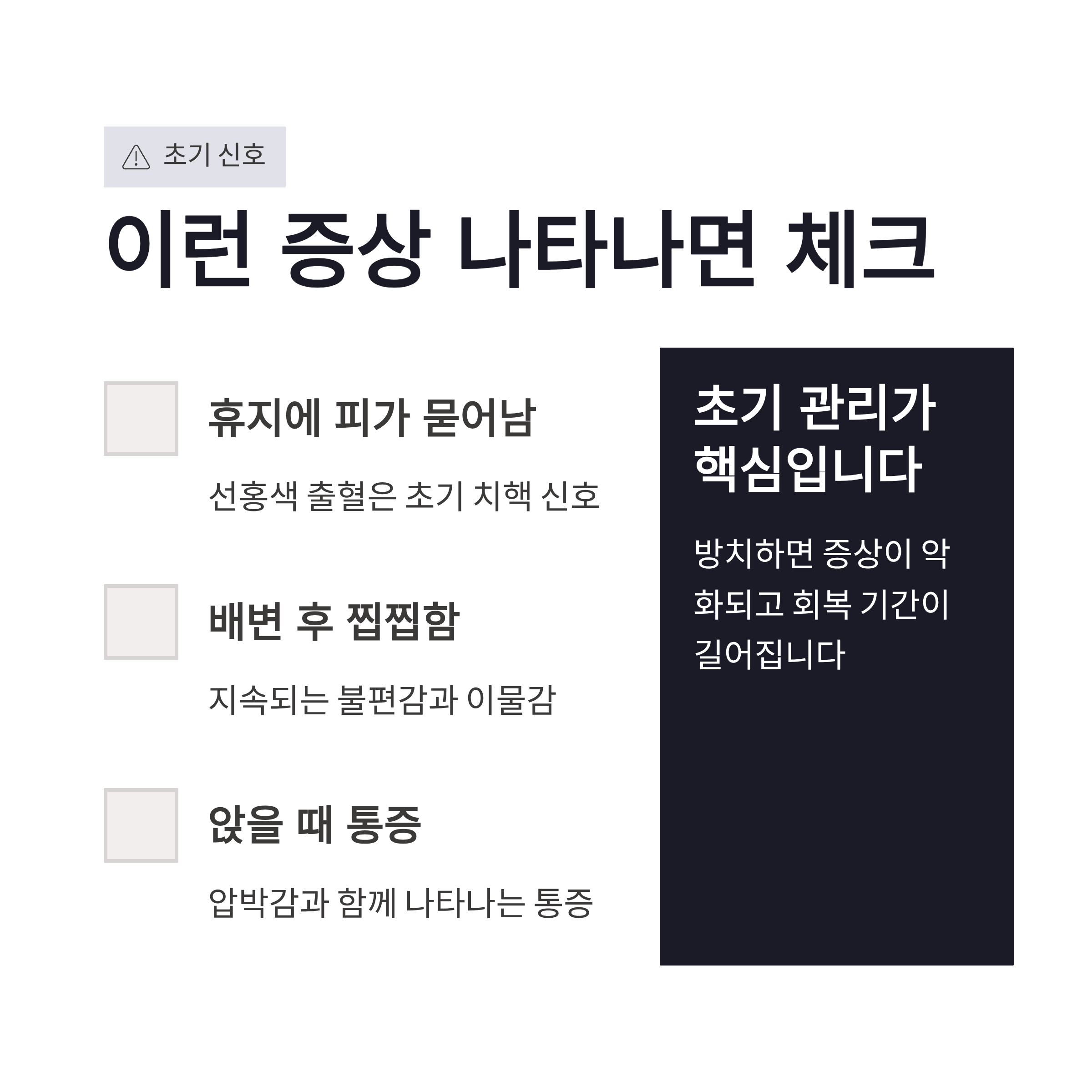 #항문불편증상 #치질초기증상 #항문통증원인 #항문가려움 #배변출혈 #치핵치열 #항문건강관리 #좌욕효과 #변비관리 #생활습관개선 #건강정보2026 #성인질환관리 #통증원인분석 #예방중심관리 #건강습관
