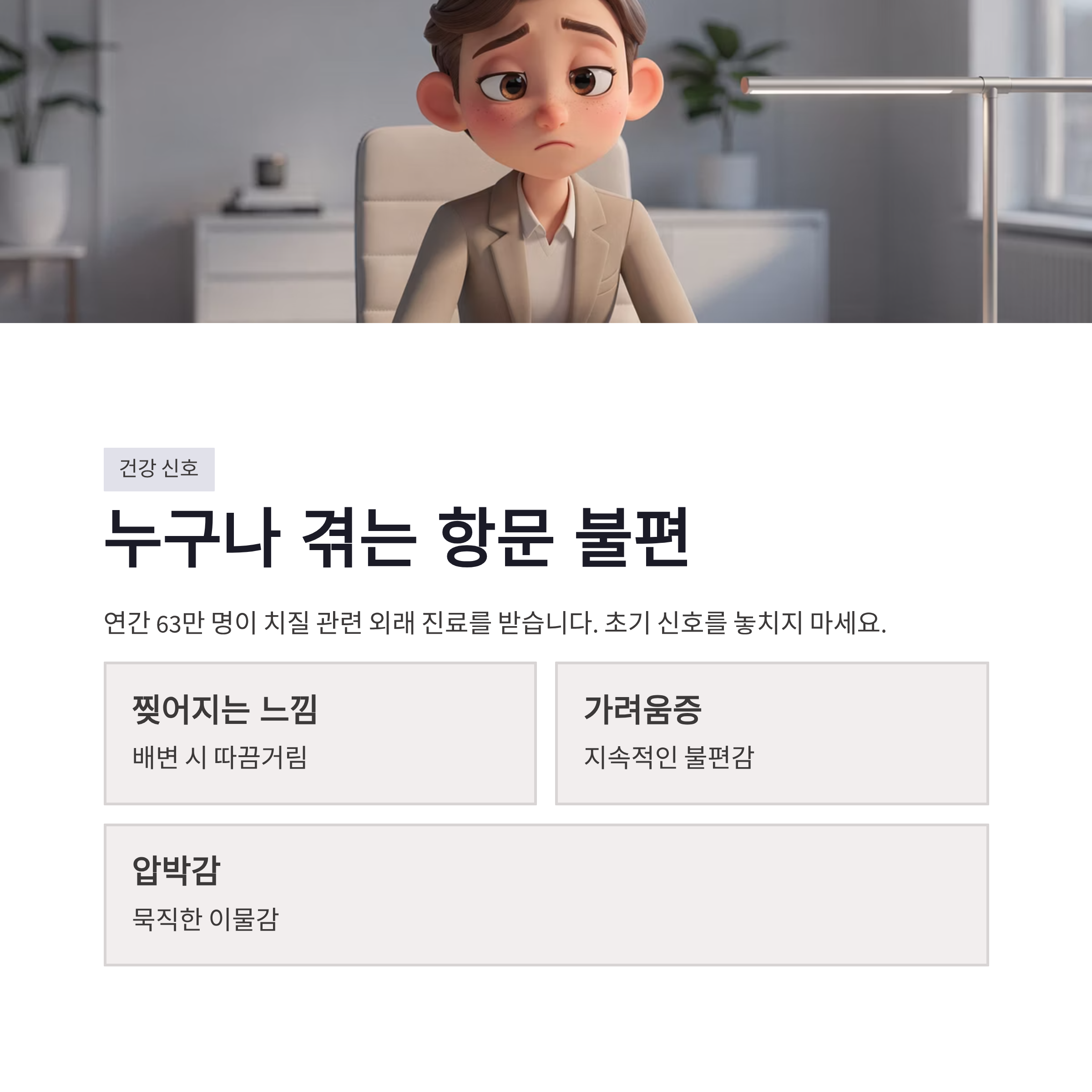 혹시 요즘 앉아 있을 때 불편하거나, 배변 후 찝찝함이 계속되나요? 그게 바로 항문 불편 증상의 시작일 수도 있습니다. 오늘부터라도 물 한 컵 더 마시고, 오래 앉는 습관 조금만 줄여보는 건 어떠실까요.