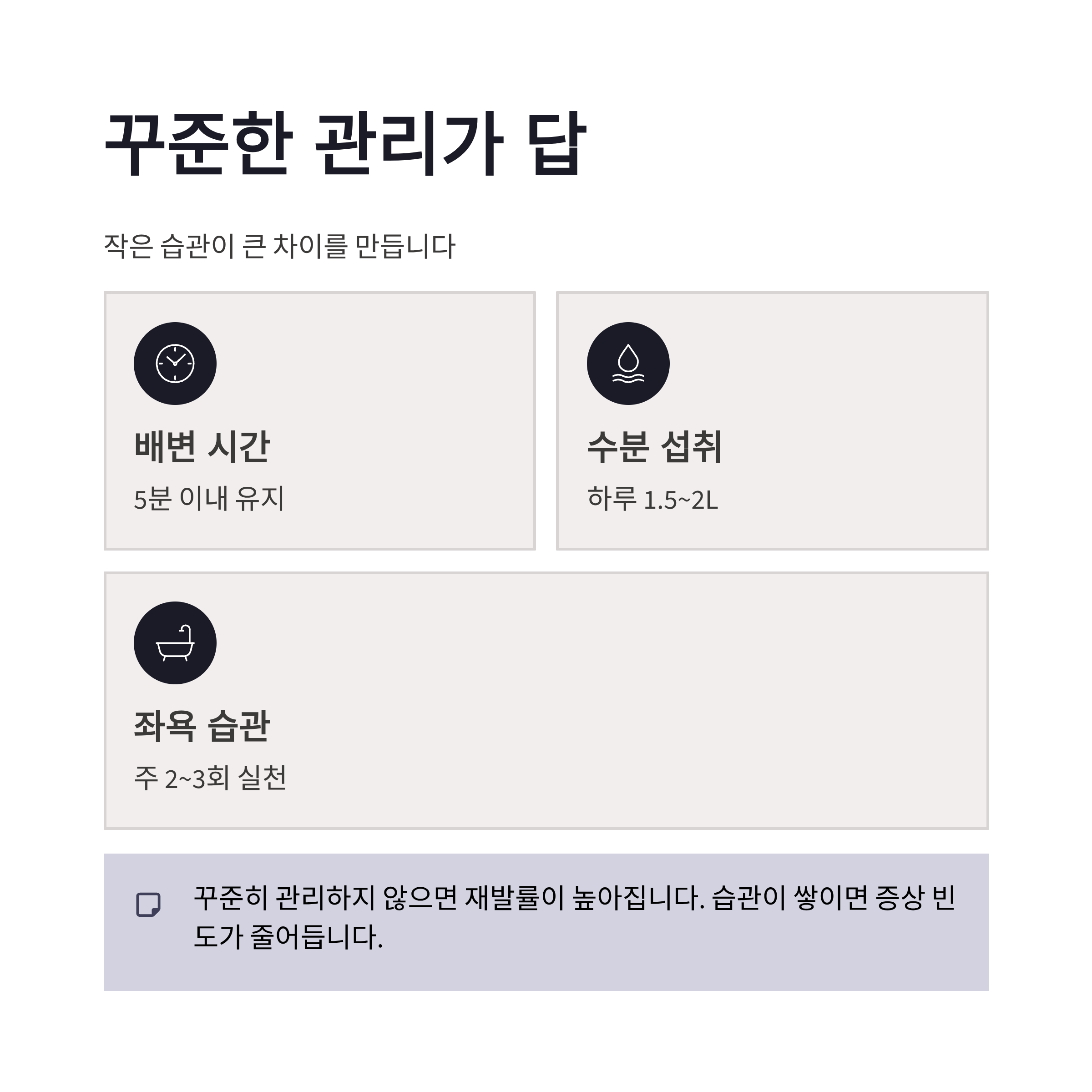 최근 트렌드는 ‘예방 중심 관리’예요. 배변 시간 5분 이내 유지, 하루 물 1.5~2L 섭취, 좌욕 주 2~3회 권장 같은 기본 관리가 강조됩니다. 작은 습관이 쌓이면 항문 불편 증상 빈도 자체가 줄어든다고 하더라구요.