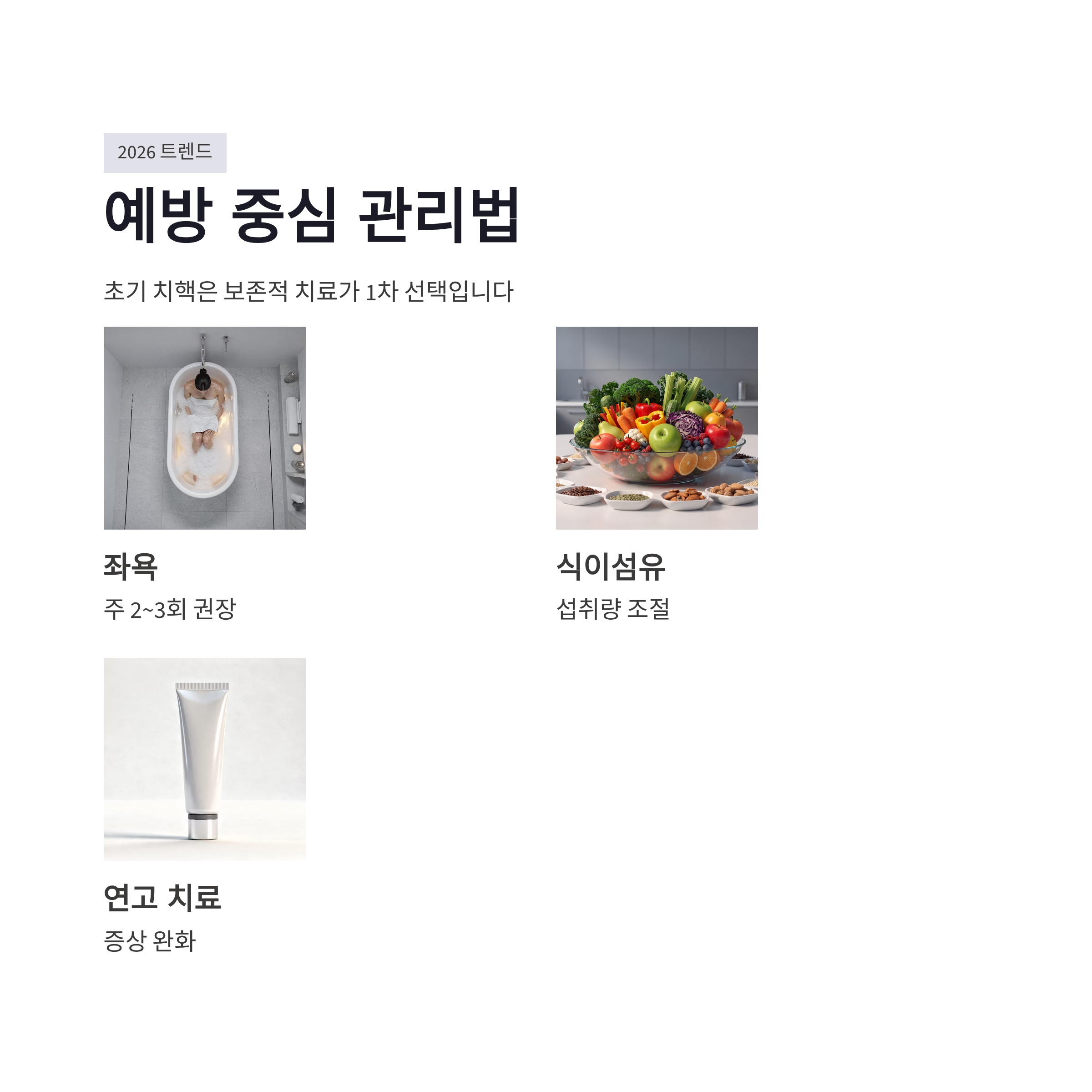 요즘은 항문 불편 증상 치료도 예전처럼 무조건 수술로 가는 분위기는 아니라고 하더라구요. 2026년 기준으로 초기 치핵의 경우 좌욕, 연고 치료, 식이섬유 섭취 조절 같은 보존적 치료가 1차 선택입니다.