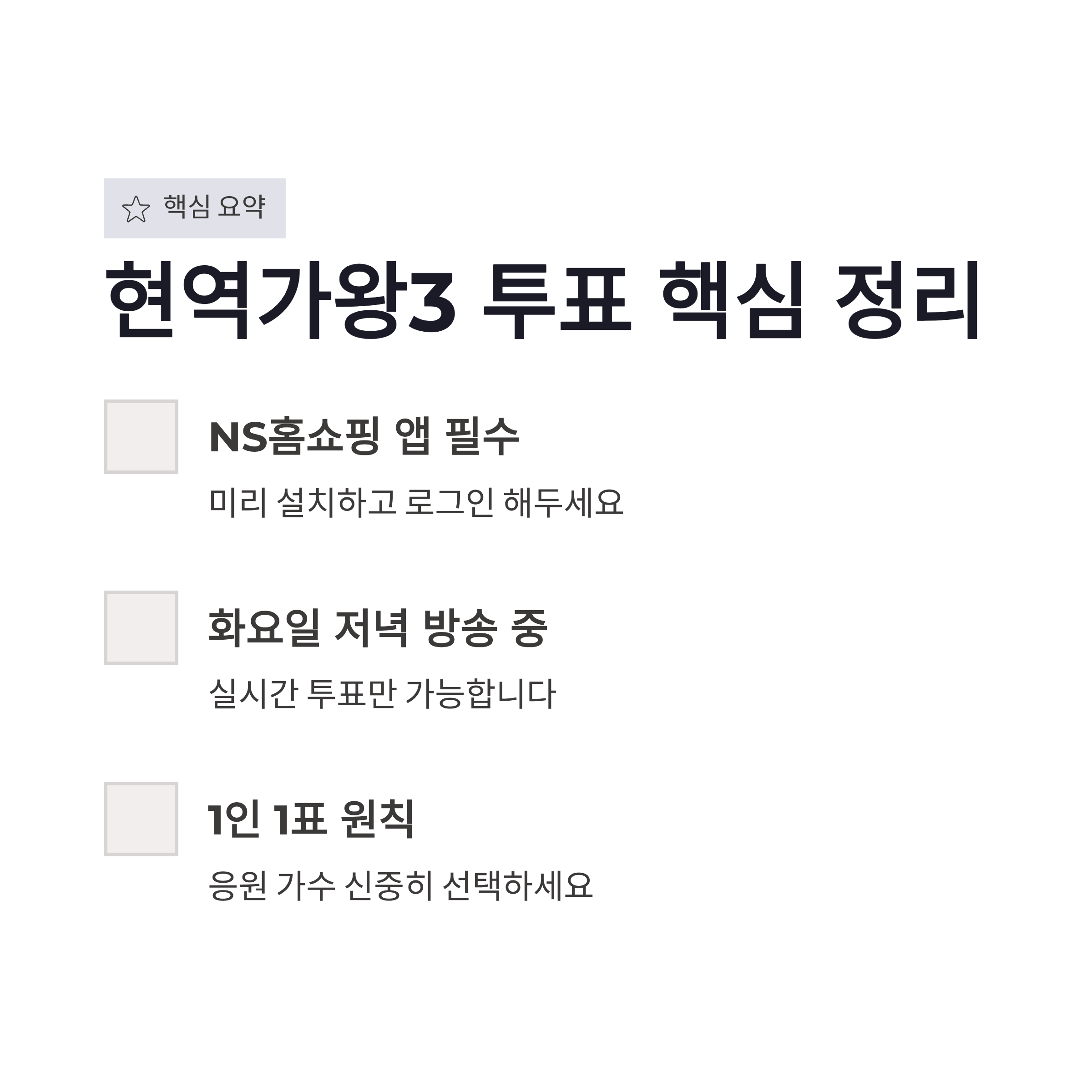 | 단계 | 현역가왕3 투표하기 절차 | 체크 포인트 | | -- | ------------- | ----------------- | | 1 | NS홈쇼핑 앱 설치 | 안드로이드·아이폰 모두 가능 | | 2 | 회원 로그인 | 비회원은 투표 불가 | | 3 | 방송 중 투표 배너 클릭 | 현역가왕3 투표하기 전용 | | 4 | 응원 가수 선택 | 1인 1표, 중복 불가 | | 5 | 투표 완료 | 결과 즉시 반영 |