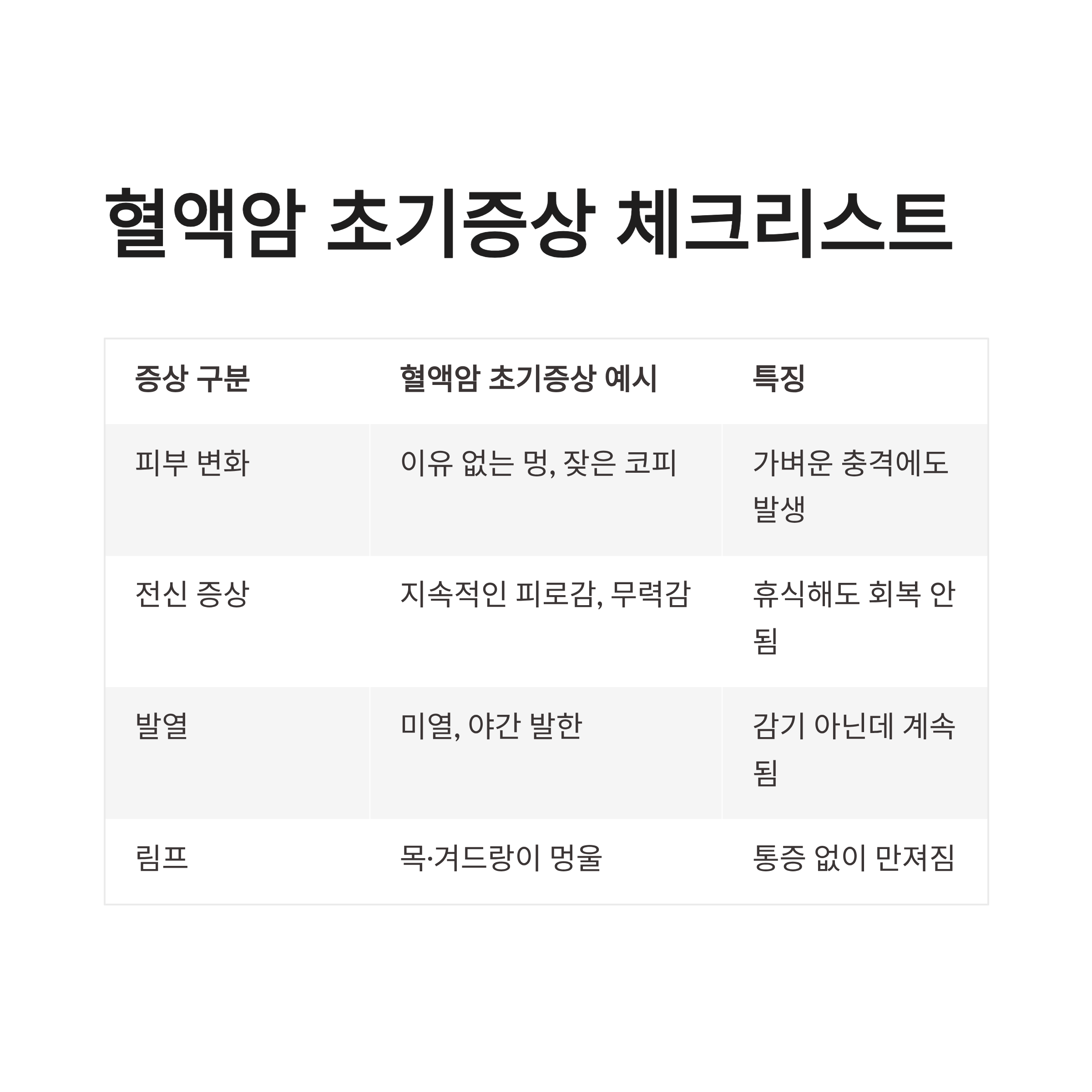 | 증상 구분 | 혈액암 초기증상 예시 | 특징 |