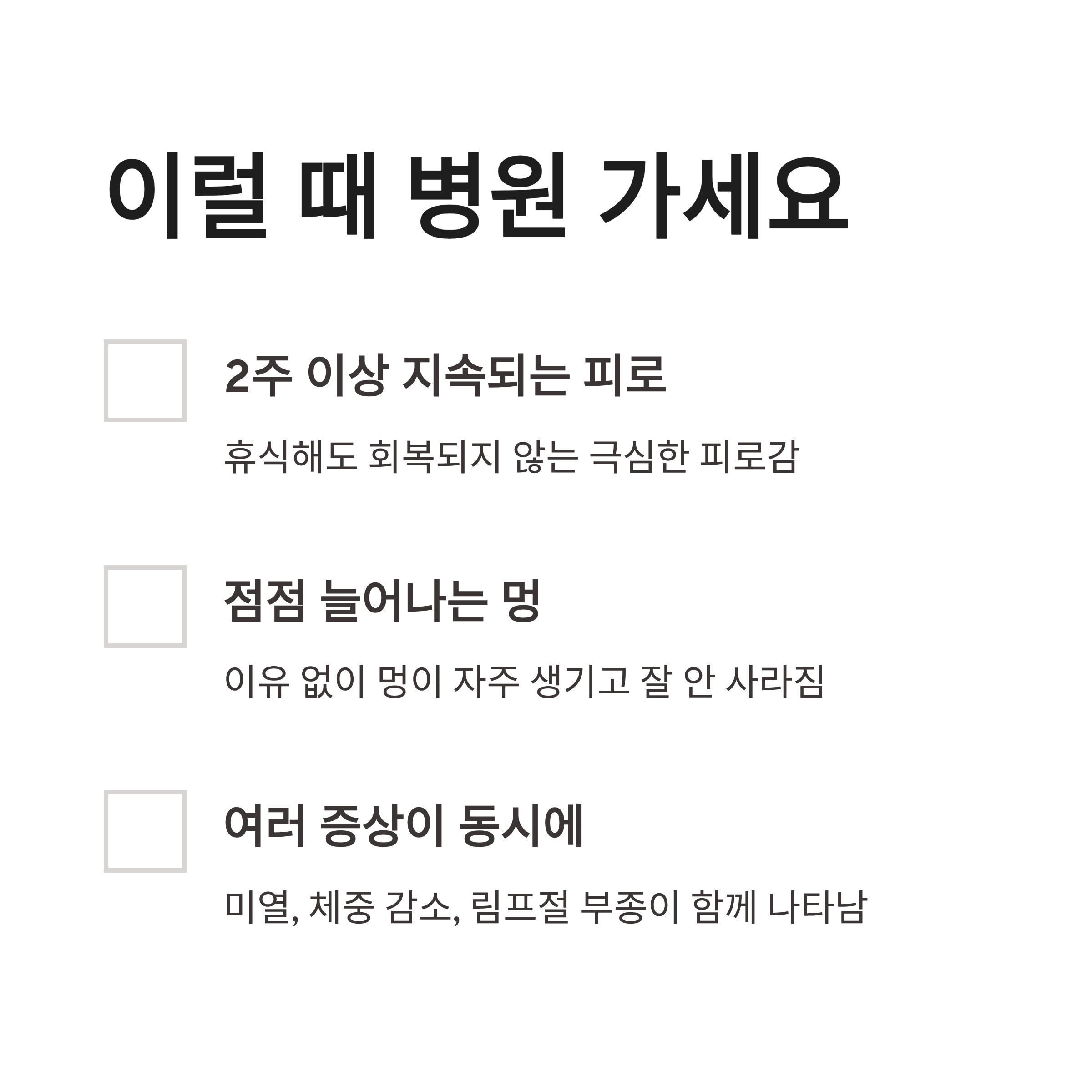 | 전신 증상 | 지속적인 피로감, 무력감 | 휴식해도 회복 안 됨 |