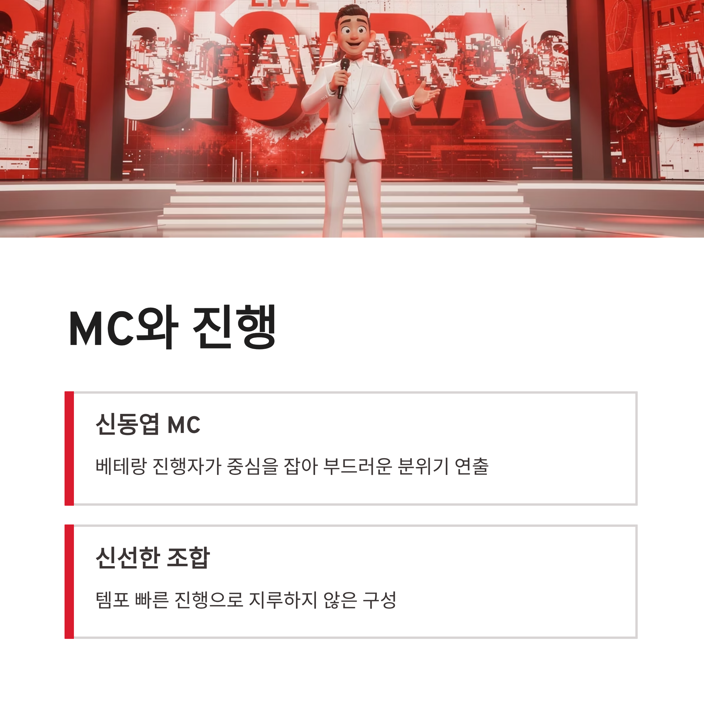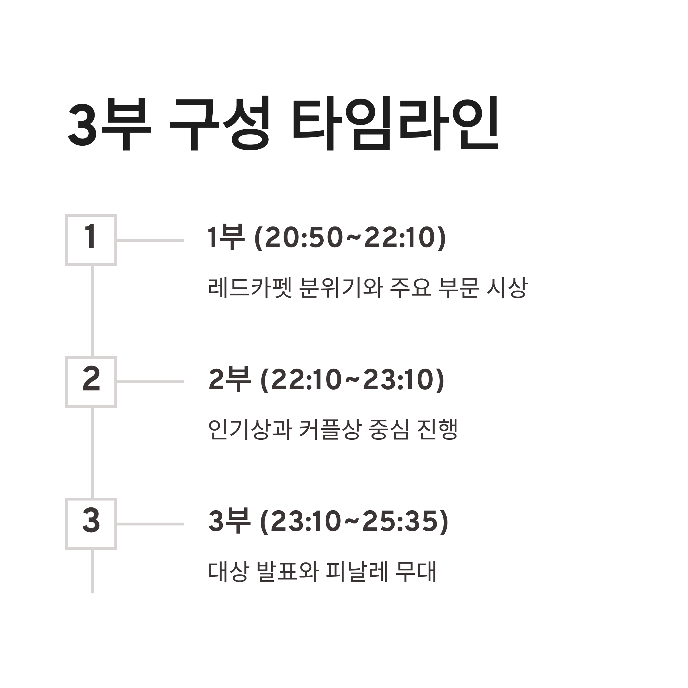 | 구분 | 시간 | 내용 | | -- | ----------- | ------------------- | | 1부 | 20:50~22:10 | 레드카펫 분위기 + 주요 부문 시상 | | 2부 | 22:10~23:10 | 인기상·커플상 중심 | | 3부 | 23:10~25:35 | 대상 발표 + 피날레 |