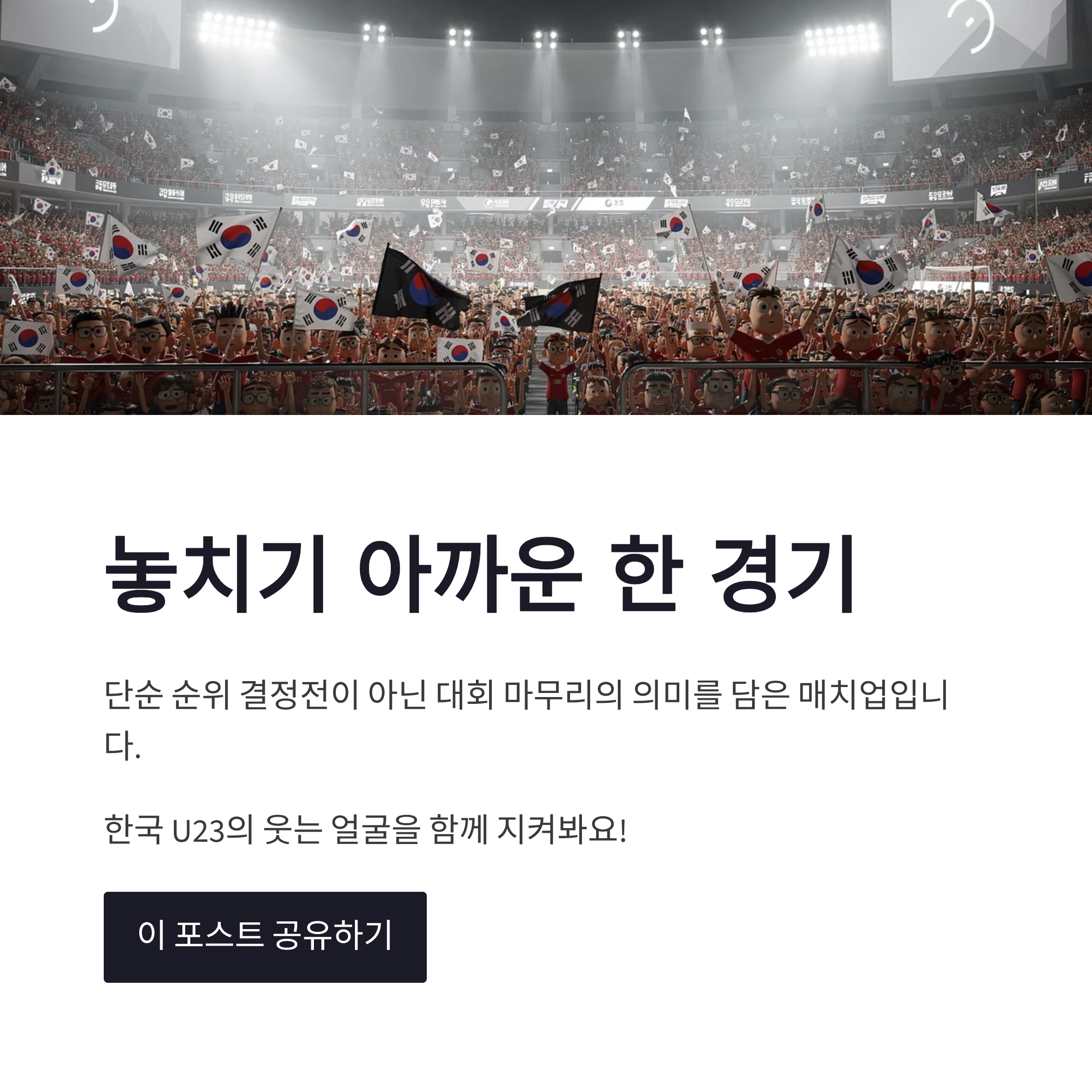 정리해보면 2026년 01월 24일 베트남 U23 대한민국 U23 중계는 단순한 순위 결정전이 아니라, 대회 마무리를 어떻게 하느냐가 걸린 경기였습니다. 동메달이 주는 상징성도 분명 있고, 선수들에겐 다음 단계로 가는 중요한 경험이 되겠쥬. 축구 좋아하신다면 그냥 흘려보내기엔 아까운 매치업이었구요. 편하게 중계 틀어두고 흐름 보면서 즐기기 딱 좋은 경기라 생각합니다. 과연 한국 U23이 웃으면서 대회를 마무리할 수 있을지, 같이 지켜보는 재미가 있겠쥬?