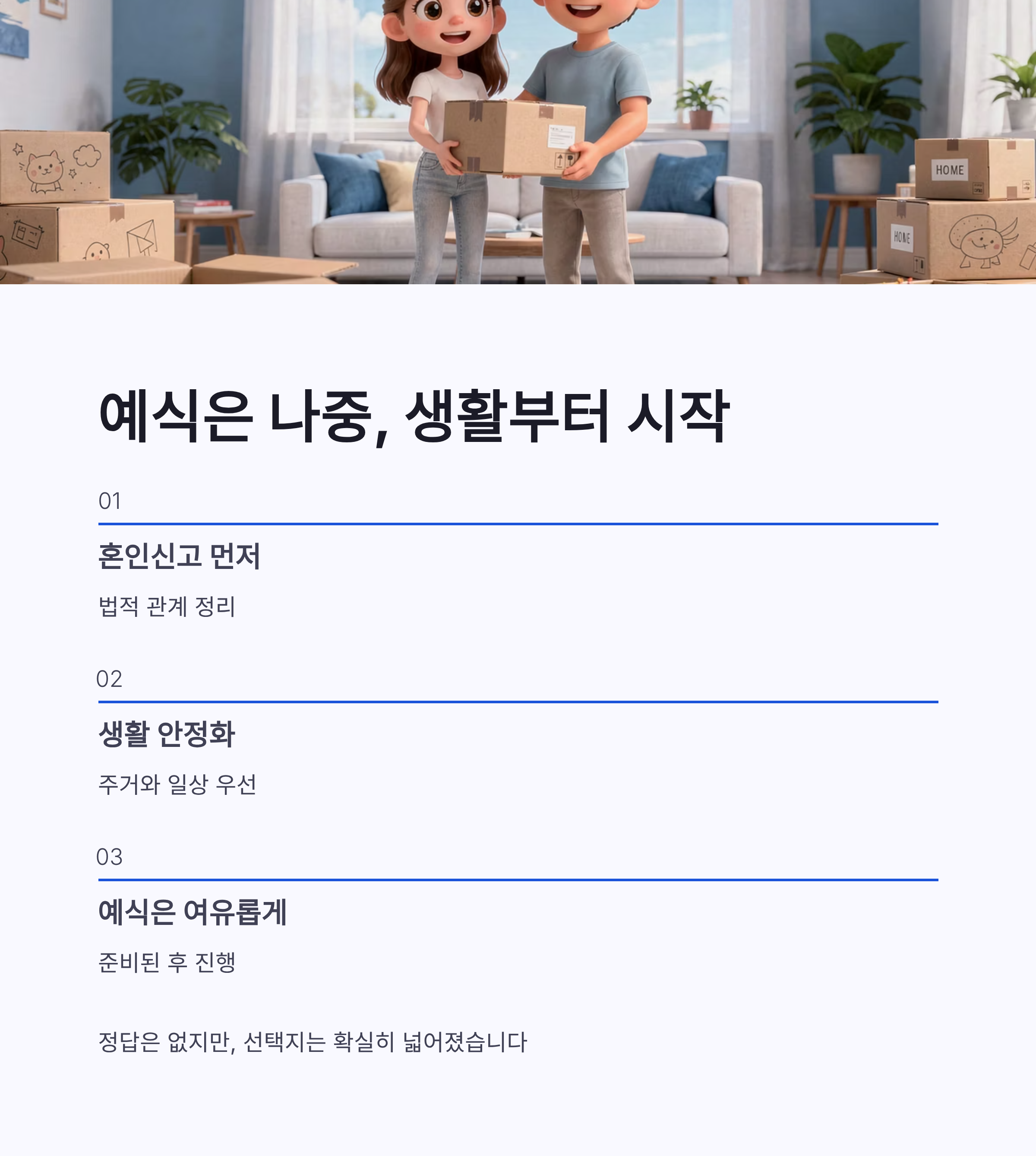 | 법적 준비 | 혼인신고 시점 | 일정 미뤄도 신고 먼저 하는 경우 많음 |