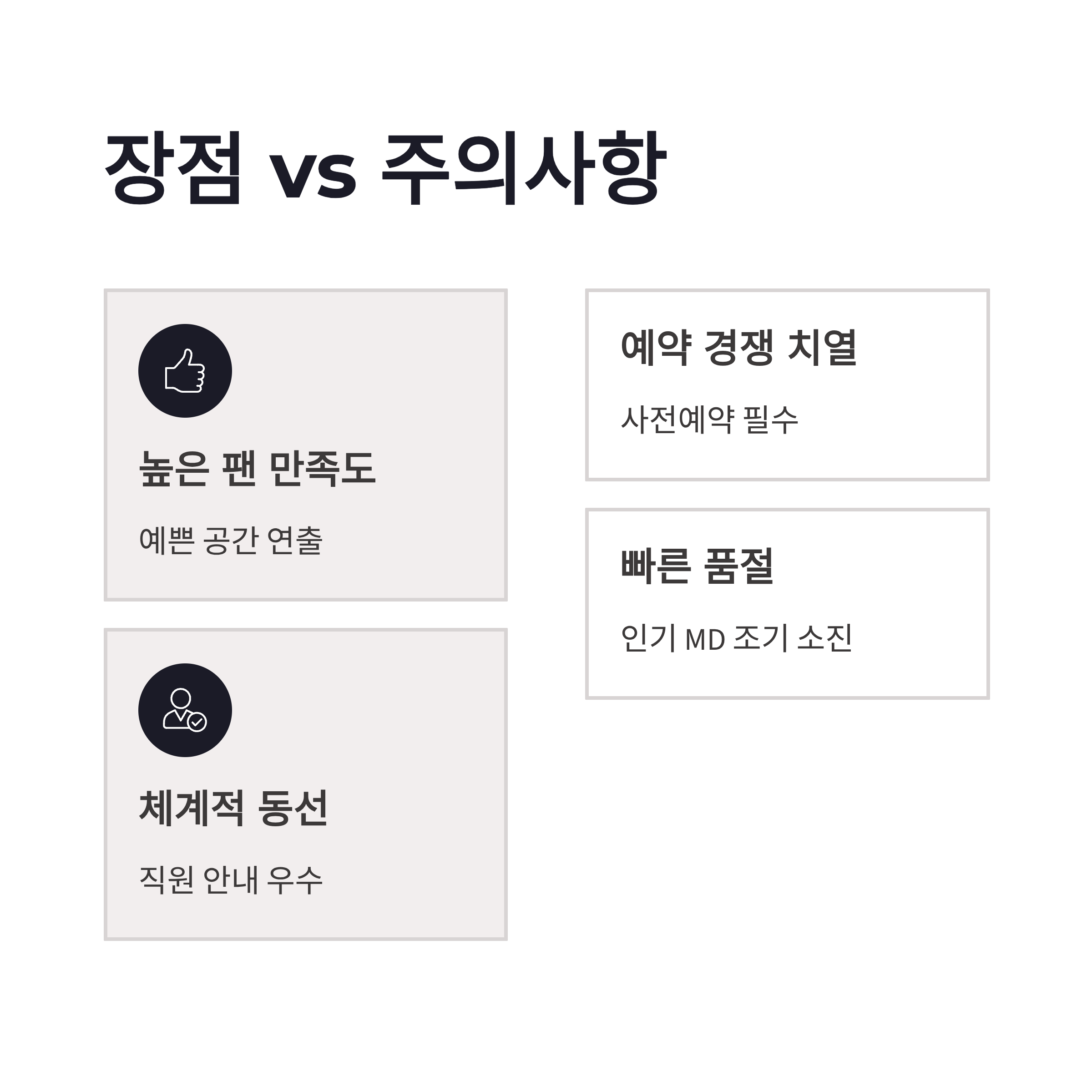 이번 NCT WISH 팝업스토어는 이벤트가 은근 다양했어요. 구매 금액별로 증정되는 굿즈도 있고, 미션 완료 시 랜덤 혜택도 있었는데, 이게 날짜랑 시간대마다 조금씩 달라요. 그래서 방문 전날 공지 한 번 더 보는 게 좋겠더라구요. 장점부터 말하면, 팬 만족도는 확실히 높은 편입니다. 공간 연출도 예쁘고, 직원 동선 안내도 잘 되어 있어서 정신없지 않았어요. 다만 단점이라면… 역시 사전예약 경쟁이 빡셌다는 점ㅠㅠ 그리고 인기 MD는 생각보다 빨리 소진될 수 있다는 거. 요즘 팝업스토어 트렌드가 “짧고 굵게, 체험 중심”인데, WISH BAKERY는 그 흐름을 딱 잘 탄 느낌이었어요. 팬이 아니라도 공간 자체가 귀여워서 구경할 맛은 충분했구요.