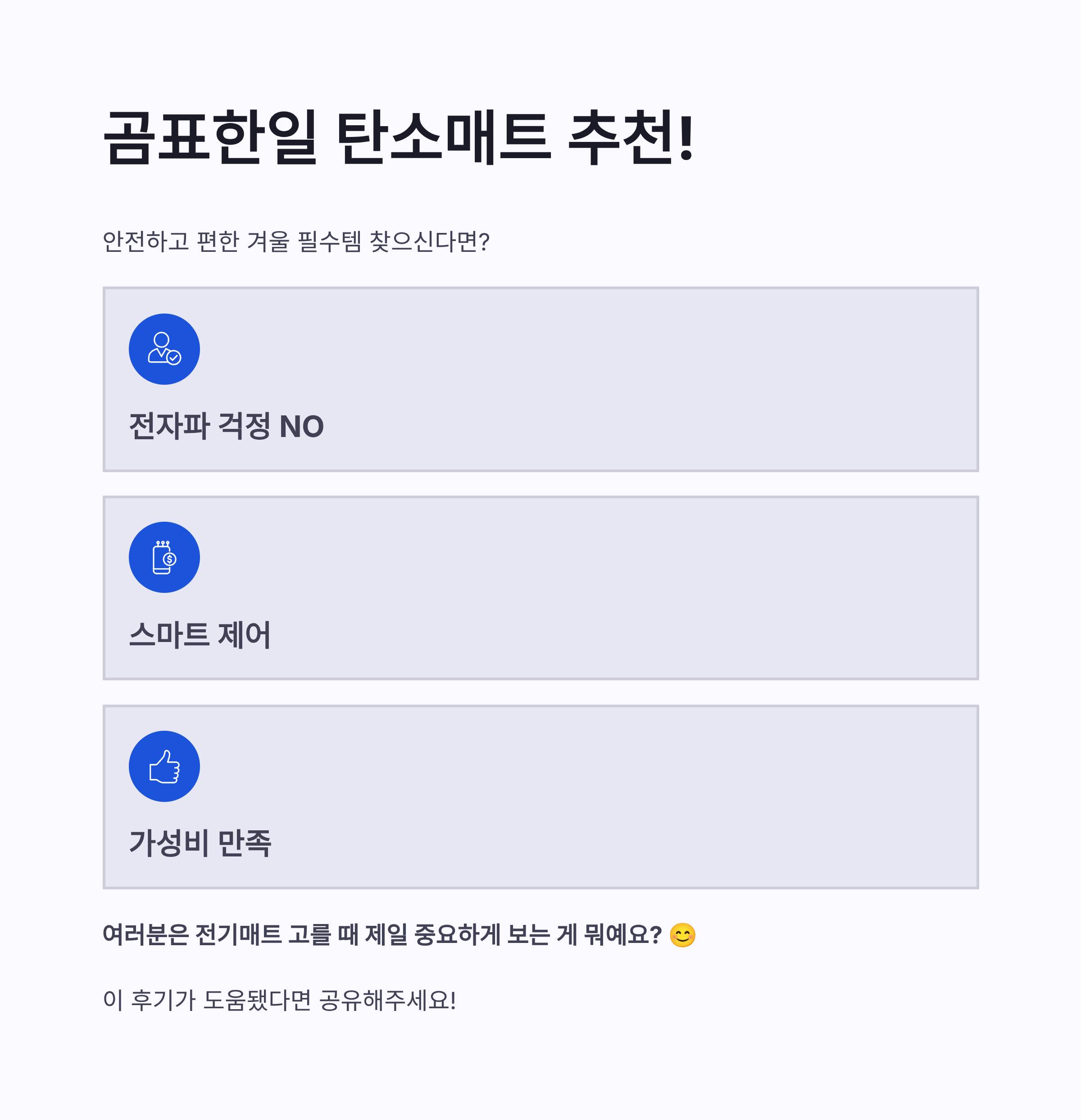 정리해보면 곰표한일 탄소매트는 “괜히 비싼 거 말고, 안전하고 편한 거” 찾는 분들한테 딱이에요. 아침에 이불에서 나오기 덜 괴로워졌고ㅋㅋ 수면 질도 은근히 좋아진 느낌이랄까… 겨울마다 전기매트 고민하셨다면 한 번쯤 써볼 만한 선택지 같아요. 여러분은 전기매트 고를 때 제일 중요하게 보는 게 뭐예요?
