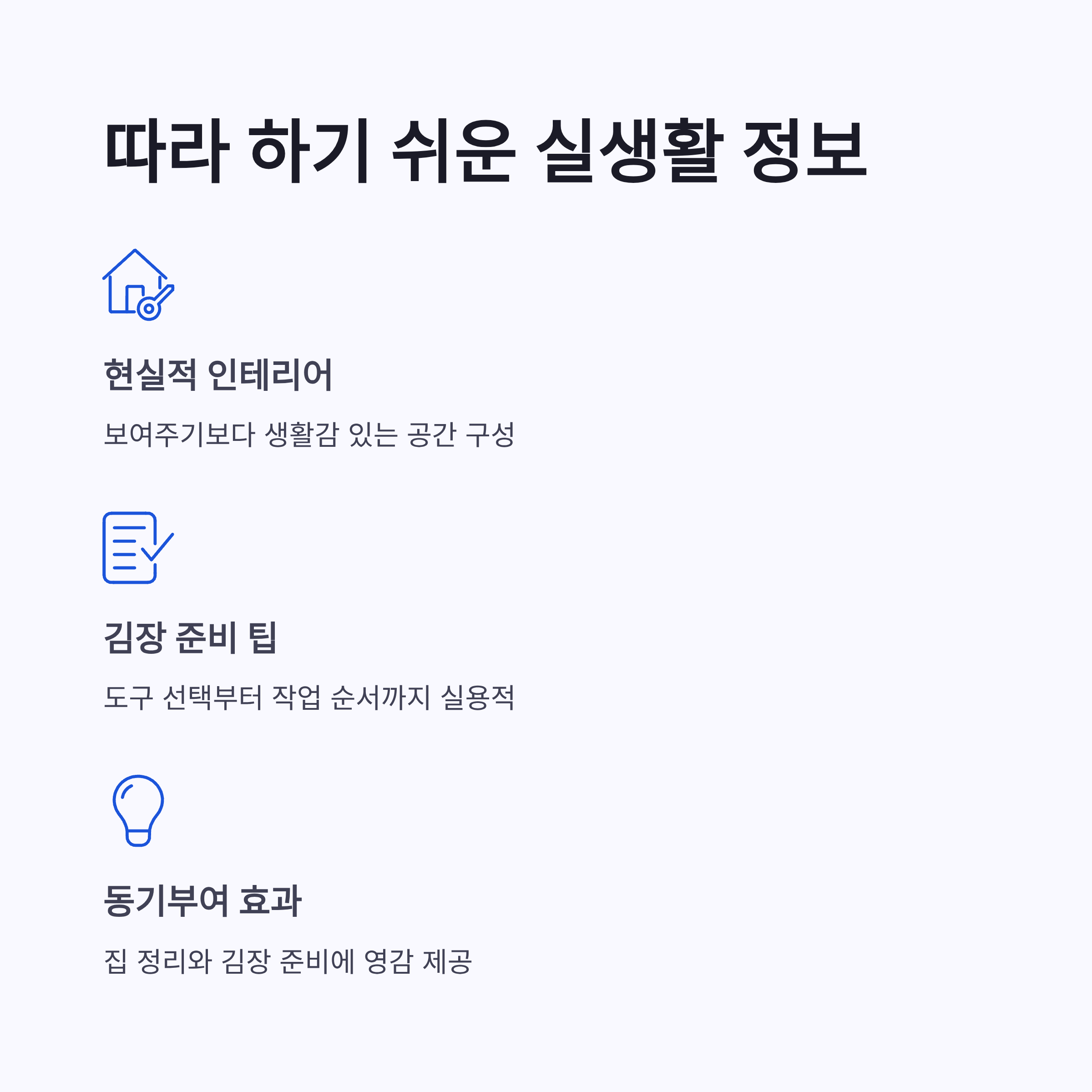 나혼자산다 626회에서 은근히 느껴진 요즘 트렌드도 있어요. 집 인테리어는 ‘미니멀 + 생활형’이 확실히 대세 같았구요. 장점은 정리 부담이 적고, 단점은 꾸미는 재미가 덜하다는 점? 김장도 마찬가지예요. 예전처럼 대규모보다는 필요한 만큼만, 대신 도구는 제대로 쓰는 느낌이었어요. 김장 도구에 투자하면 몸이 덜 고생한다는 거… 방송 보며 다시 느꼈네요. 솔직히 김장 한 번 하면 허리랑 손목이 ㅠㅠ 그래도 나혼자산다 626회처럼 미리 준비 잘 하면 생각보다 수월할 것 같더라구요.